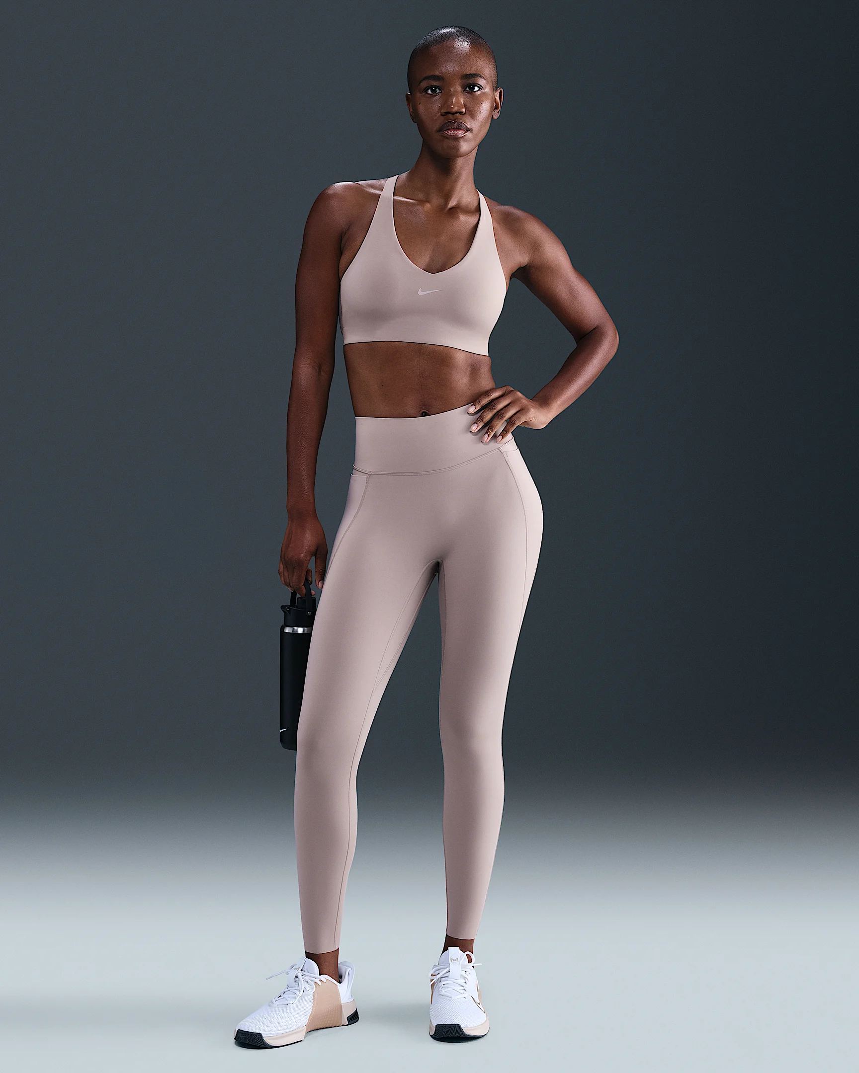 Don't let 'em see you sweat. We elevated the design of our Universa leggings to look smooth and help conceal sweat, thanks to a no-seam front and moisture-concealing technology. Their midweight, ultrasmooth fabric offers squat-proof stretch that helps lift and shape. Plus, an updated waistband resists rolling, so you can go all out with confidence. Product Details - 77% polyester/23% spandex - Laser-cut hem - Silicone Swoosh logo on left calf - Machine wash - Imported - Not intended for use as Personal Protective Equipment (PPE) - Shown: Malt/Mink Brown/Moon Particle - Style: HQ6813-271 SIZE & FIT Model is wearing size S and is 5′11″180cm Tight fit: snug and form-fitting Medium support: feels ke a snug hold to keep everything in place 78 length: hits at ankle High-Waisted: sits at or above your natural waist for more coverage