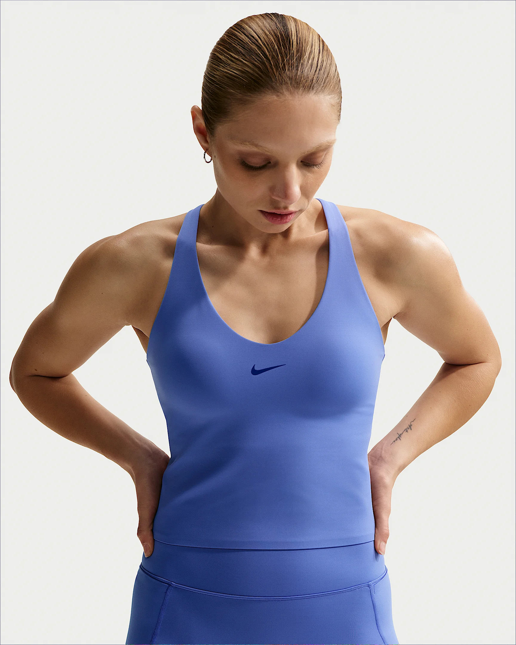 Don't let 'em see you sweat. Made with Stealth Evaporation tech, this ultrasmooth bra tank conceals moisture and feels sleek and cool to the touch. Its medium support gives you a snug hold and pads offer stay-put coverage so you can go all out with confidence. More Benefits - Keyhole at back offers cooling in high sweat area. Product Details - Gloss silicone Swoosh logo - Body: 77% polyester/23% spandex. Panels lining: 84% polyester/16% spandex. Mesh: 80% polyester/20% spandex; Elastic: 81% nylon/19% spandex. Pad: 100% polyurethane. - Machine wash - Imported - Shown: Sapphire/Bright Blue/Deep Night - Style: IF0950-570 SIZE & FIT Model is wearing size S Model height: 5′10″178cm Model bust: 33″84cm Tight fit: snug and form-fitting Medium support: feels ke a snug hold to keep everything in place