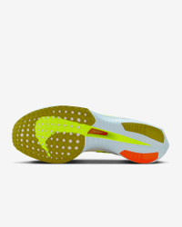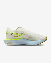 Catch 'em if you can. Giving you race-day speed to conquer any distance, the Nike Vaporfly 3 is for the chasers, the racers, the elevated pacers who can’t turn down the thrill of the pursuit. We reworked the leader of the super shoe pack and tuned the engine underneath to help you chase personal bests from a 10K to marathon. From elite runners to those new to racing, this versatile road-racing workhorse is for those who see speed as a gateway to more miles and more seemingly uncatchable highs. More Benefits - Light padding on tongue helps reduce lace pressure at the top of your foot. - New Waffle outsole pattern with perforations saves weight and delivers multi-surface traction in various weather conditions. - Offset heel seam helps reduce friction in heel area. - Wider toe area creates a roomier fit. - Internal foam pod at the heel adds extra cushioning. Product Details - Weight: Approx. 165 g/5.8 oz (Women's size 8) - Heel-to-toe drop: 8 mm - Shown: Sail/Olive Aura/Volt/Glacier Blue - Style: HQ3464-143