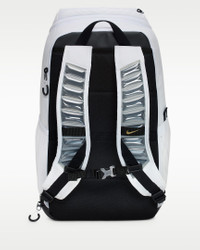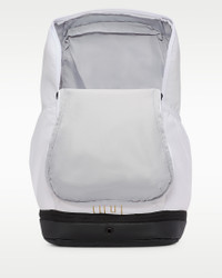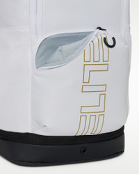 The Varsity Elite backpack holds everything you need to hoop. A large main compartment fits up to a full-size basketball. Exterior front pocket allows quick access to small items and a bottom pocket keeps sweaty clothes and dirty shoes separate. Benefits - Shoulder straps feature Air Max technology for enhanced comfort. - Top zippered pocket is plush lined to protect tech and valuables. - Internal laptop compartment fits up to a 16” laptop. Product Details - 12" W x 19" H x 9" D - Expandable side pocket - 100% polyester - Spot clean - Imported - Shown: White/Black/Metallic Gold - Style: HM9965-100