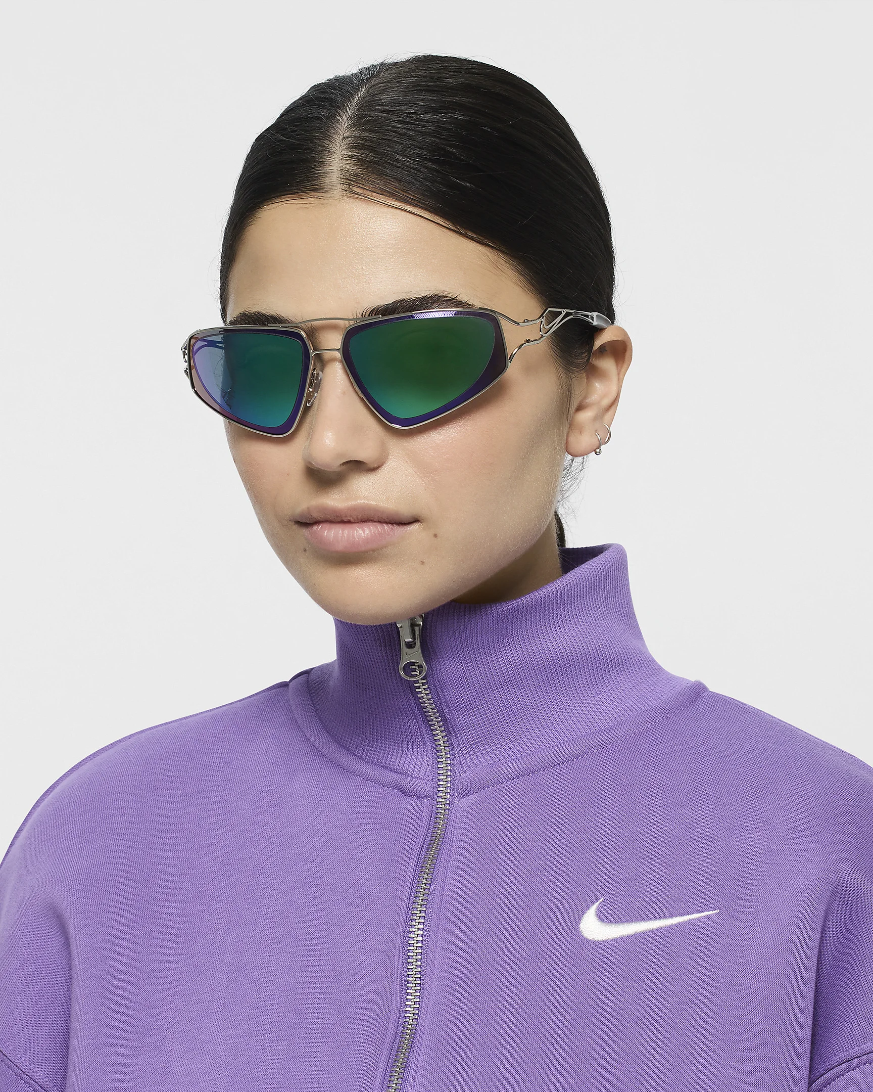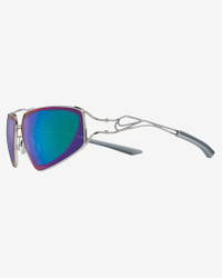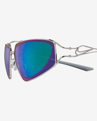 The Nike Veil is in a new arena where fashion meets sport on new terms, redefining what it means to bring your game. The duality of these frames goes even further with a double top bar and temple tips made from mixed materials and two-tone lenses for an enhanced aesthetic. Benefits - Nike Max + helps reduce light reflection and provides precise vision from all angles. - 6-base curved lens offers medium coverage with moderate peripheral light blockage. - Adjustable nose pads and temples with silicone sleeves provide enhanced grip and optimal fit. Product Details - Lightweight, durable metal frame - Temple design features - Nike Swoosh in metal - 100% UVA/UVB protection - Frame size: 63mm lens width; 13mm bridge width; 135mm temple length - Shown: Silver - Style: EV24048-043