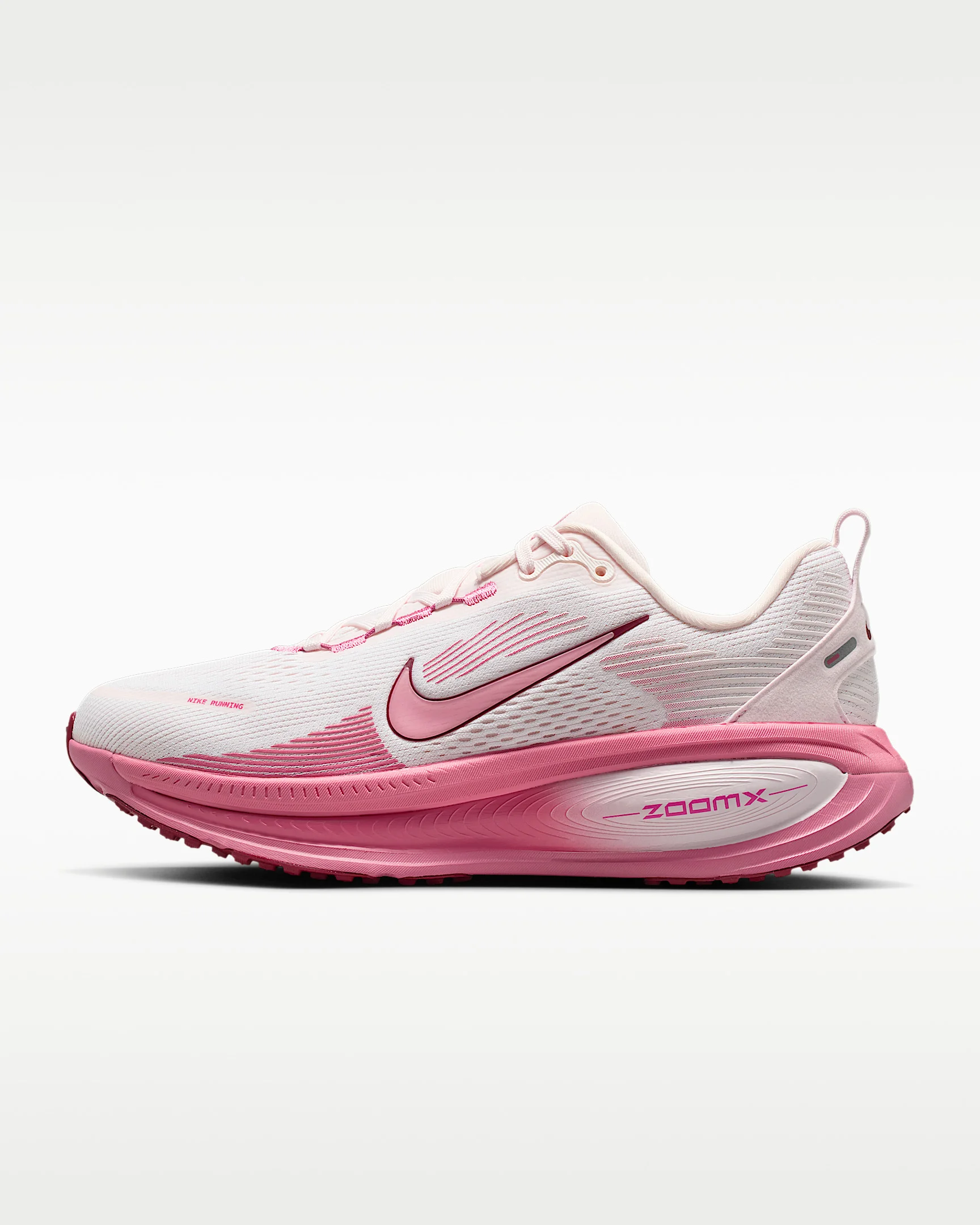 Maximum cushioning in the Vomero provides a comfortable ride for everyday runs. Our soft, cushioned ride has lightweight ZoomX foam stacked on top of responsive ReactX foam in the midsole. Plus, a redesigned traction pattern underfoot offers a smooth heel-to-toe transition. More Benefits - Newly stacked foam midsole with premium ZoomX on top of ReactX foam Product Details - Weight: Approx. 263g/9.3oz (Women’s US 8) - Heel-to-toe drop: 10mm - Shown: White/Pearl Pink/Team Red/Peony - Style: IQ9687-100