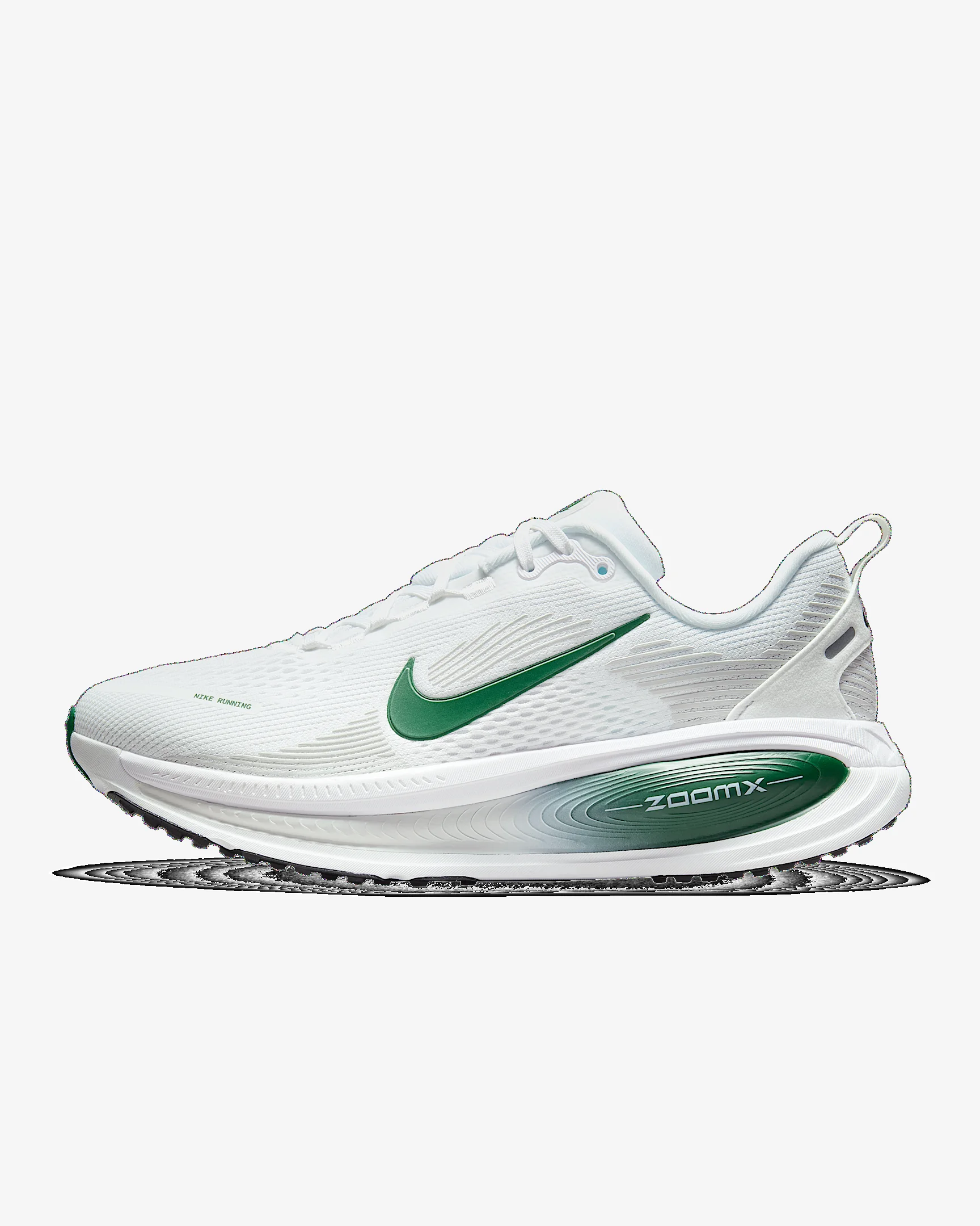 Maximum cushioning in the Vomero provides a comfortable ride for everyday runs. Our softest, most cushioned ride has lightweight ZoomX foam stacked on top of responsive ReactX foam in the midsole. Plus, a redesigned traction pattern offers a smooth heel-to-toe transition. Product Details - Weight: Approx. 263g/9.3oz (Women’s US 8) - Heel-to-toe drop: 10mm - MR-10 Last - Our best, most consistent fit - Not intended for use as Personal Protective Equipment (PPE) - Shown: White/Photon Dust/Metallic Silver/Gorge Green - Style: IB4032-103