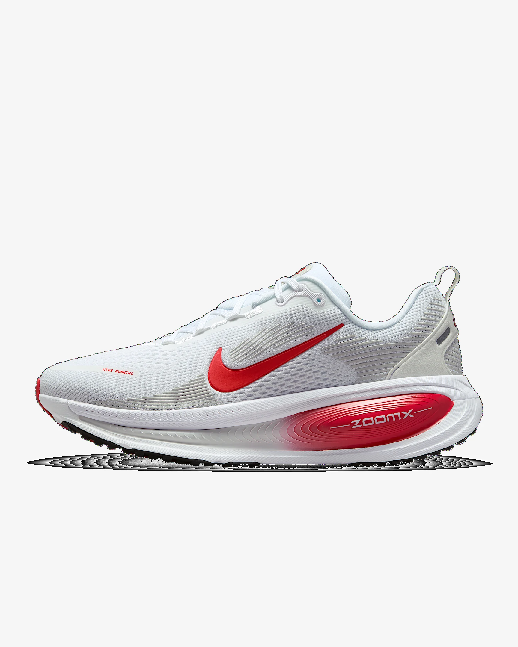 Maximum cushioning in the Vomero provides a comfortable ride for everyday runs. Our softest, most cushioned ride has lightweight ZoomX foam stacked on top of responsive ReactX foam in the midsole. Plus, a redesigned traction pattern offers a smooth heel-to-toe transition. Product Details - Weight: Approx. 263g/9.3oz (Women’s US 8) - Heel-to-toe drop: 10mm - MR-10 Last - Our best, most consistent fit - Not intended for use as Personal Protective Equipment (PPE) - Shown: White/Photon Dust/Metallic Silver/University Red - Style: IB4032-114