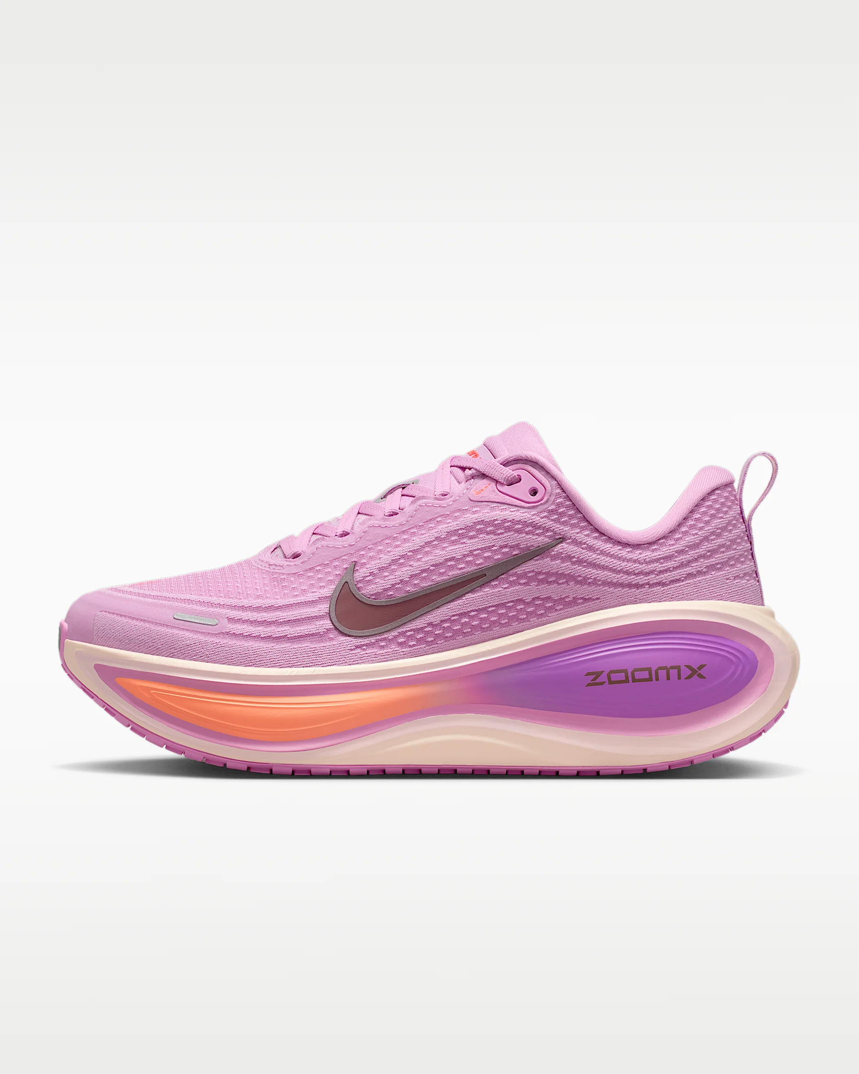 Take maximum cushioning to the next level with the Vomero Plus. It provides an ultra-comfortable ride for every day runs thanks to a mountainous stack of full-length ZoomX foam, the most responsive foam in the industry. Plus, the engineered mesh upper is made of soft, breathable yarn for a comfortable fit. Product Details - Weight: Approx. 242g/8.5 oz (Women's US 8) - Heel-to-toe drop: 10mm - Webbed lace loops for an adjustable fit - Reflective details - Not intended for use as Personal Protective Equipment (PPE) - Shown: Light Magenta/Pink Foam/Bright Violet/Black - Style: HV8154-503