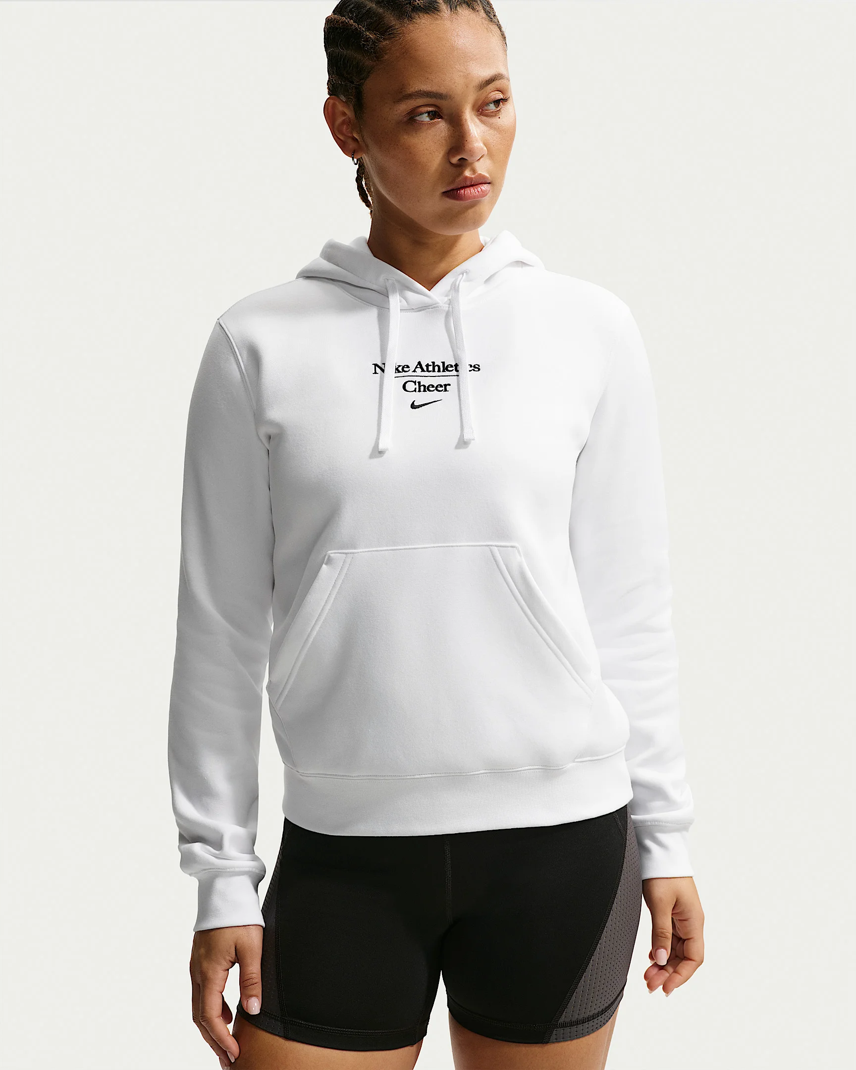 It's your sport. Make sure everybody knows in this cozy fleece Nike Cheer hoodie. Product Details - 82-100% cotton/0-18% polyester - Material percentages may vary. Check label for actual content. - Machine wash - Imported - Shown: White - Style: APS551NACH-WHT