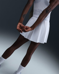 This timeless skirt is made with lightweight woven fabric for cool comfort on the court. Stretchy, built-in shorts give you secure coverage while pockets on both legs offer easy access to your essentials. Benefits - Nike Dri-FIT technology moves sweat away from your skin for quicker evaporation, helping you stay dry and comfortable. - Inner shorts let you tuck spare balls under the hem for convenient storage. - Mesh in elastic waistband enhances breathability. - Drop-in pockets on inner shorts fit most phones. Product Details - Body: 100% polyester. Tight/Panels lining: 78-79% polyester, 21-22% spandex. Elastic: 86% polyester/14% spandex. Gusset lining: 100% polyester. - Machine wash - Imported - Shown: White/White - Style: FZ6512-100 SIZE & FIT Model is wearing size S and is 5′9″175cm Standard fit: easy and traditional