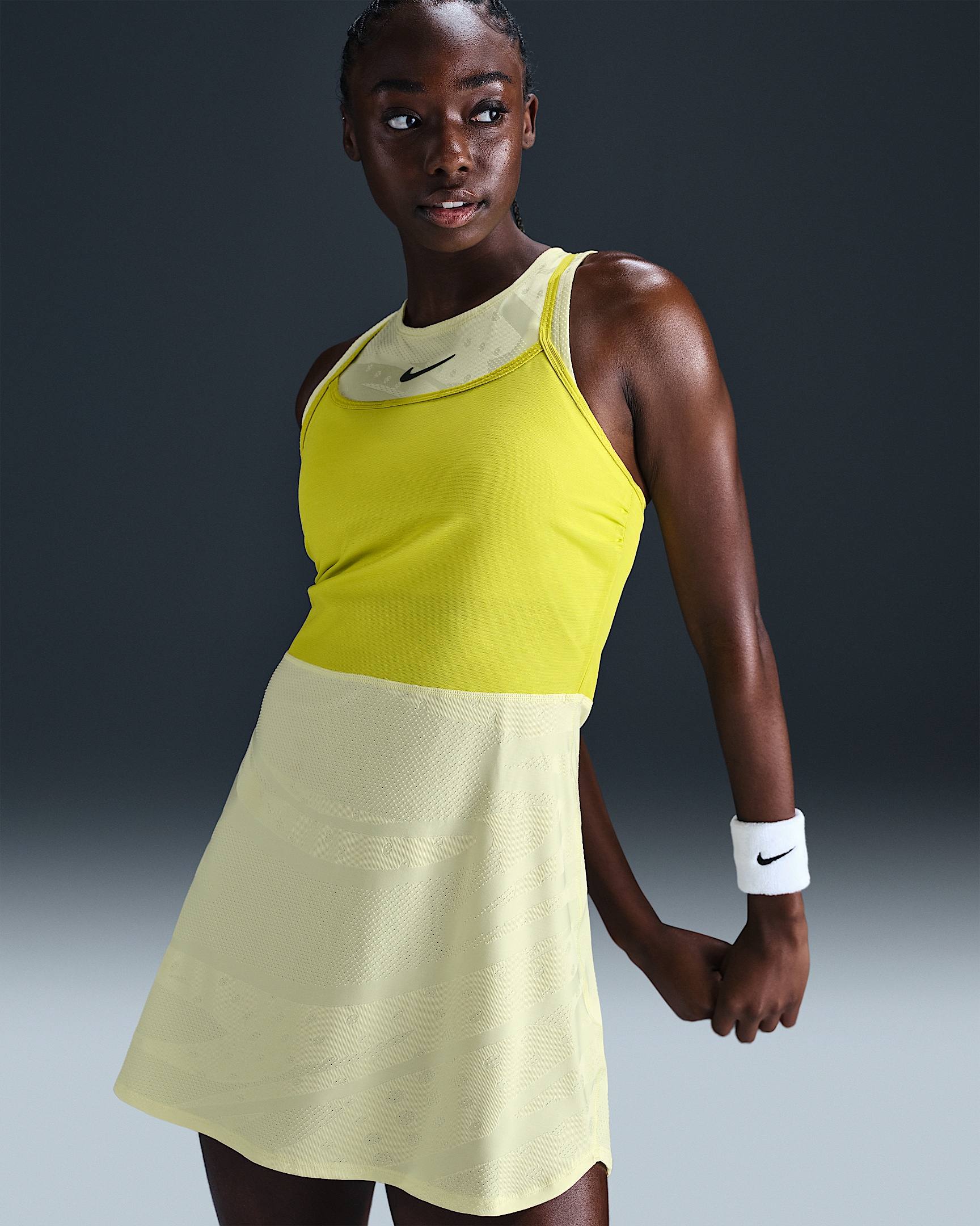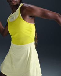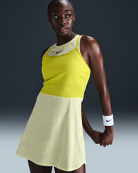 Stay cool under pressure in this fitted tennis dress. Breathable jacquard fabric has plenty of stretch while sweat-wicking tech helps you stay dry. Benefits - Nike Dri-FIT technology moves sweat away from your skin for quicker evaporation, helping you stay dry and comfortable. - High neckline offers reliable coverage for all your stances. Product Details - Extended back hem - Mesh overlay - Body: 89% polyester/11% spandex. Overlays: 82% polyester/18% spandex. - Machine wash - Imported - Shown: Luminous Green/High Voltage/High Voltage/Medium Ash - Style: FZ6463-331 SIZE & FIT Model is wearing size S and is 5′9″175cm Tight fit: snug and form-fitting