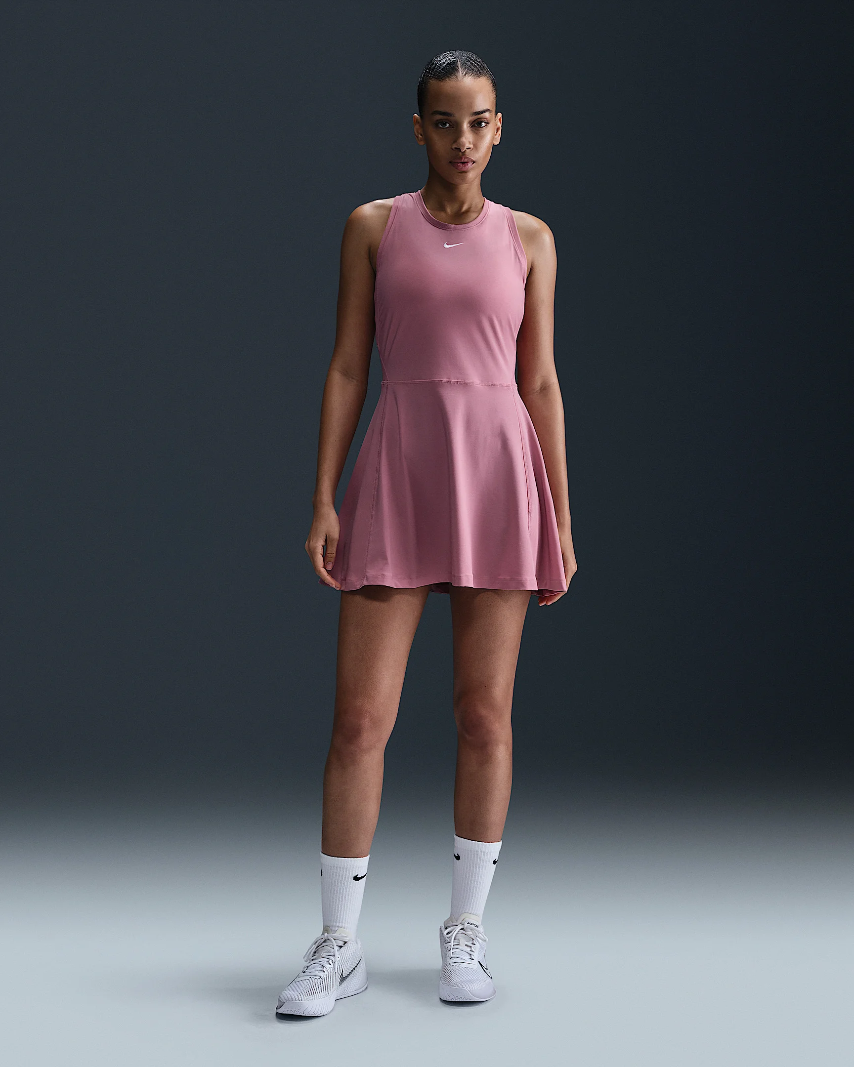 Made with super-smooth, ultra-stretchy fabric that dries quickly, this Victory dress makes it easy to focus on your swing. Ribbed panels under the arms stretch through your full range of motion. Benefits - Nike Dri-FIT technology moves sweat away from your skin for quicker evaporation, helping you stay dry and comfortable. - High neckline helps keep you covered in all your stances. Product Details - Embroidered Swoosh logo on chest - Body: 79% polyester/21% spandex. Rib: 88% polyester/12% spandex. - Machine wash - Imported - Shown: Elemental Pink/White - Style: FQ1780-699 SIZE & FIT Model is wearing size S and is 5′10″177cm Sm fit: sleek and tailored
