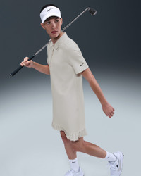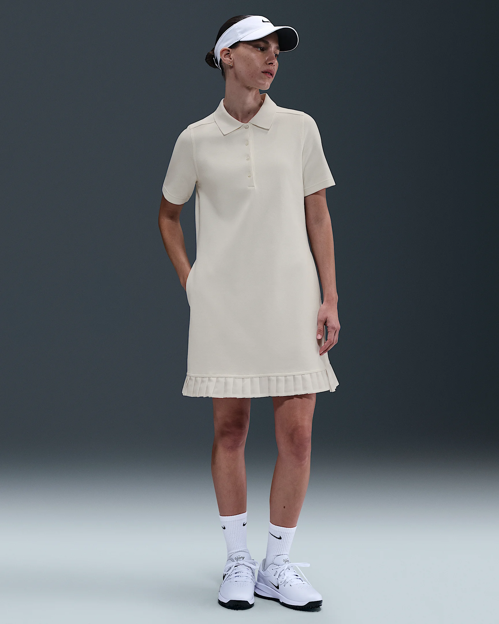 Level up your course outfit. This polo dress is crafted in midweight, breathable pique fabric and finished with a pleated hem so you can move with comfort and flair. Product Details - 4-button placket - Printed Nike Golf logo on back - Printed Swoosh logo on left arm - Body: 70% cotton/30% polyester. Bottom hem: 100% polyester. - Machine wash - Imported - Shown: Sail/Black - Style: IF8522-133 SIZE & FIT Model is wearing size S and is 5′10″178cm Standard fit: easy and traditional
