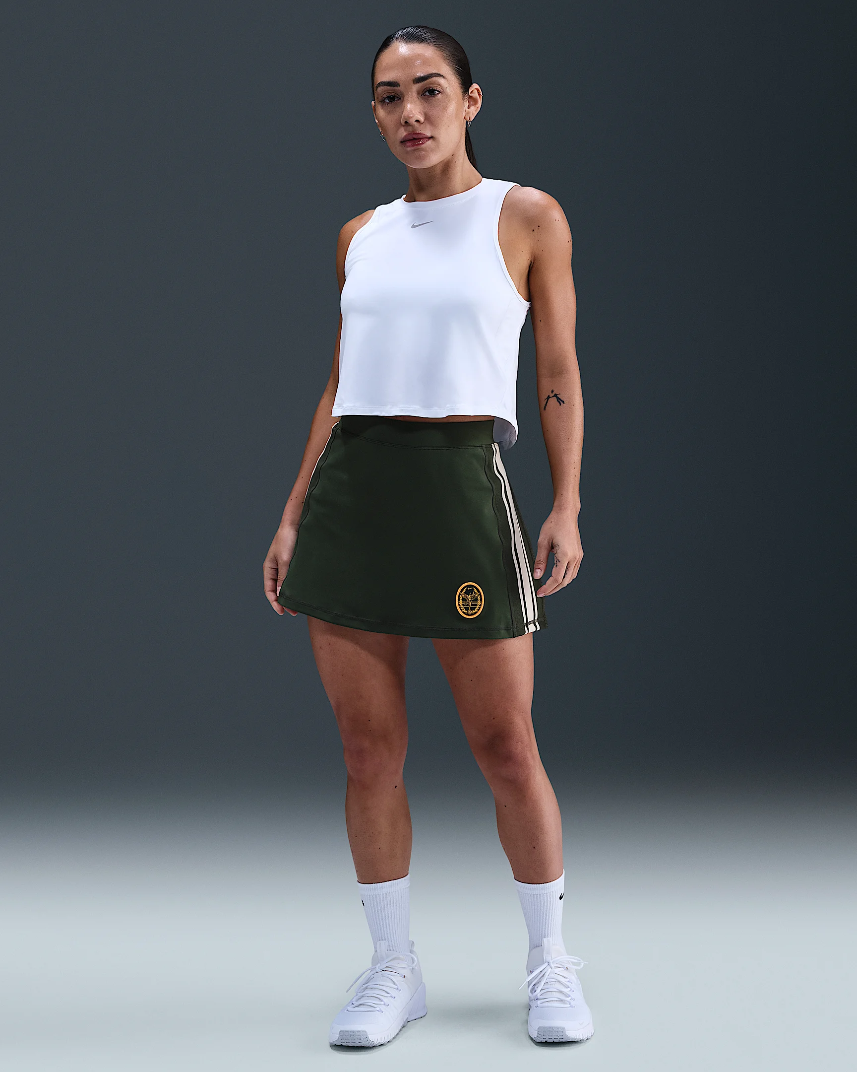 Bring the heat all day in this snug, fitted skort. The inner shorts help keep you covered as you go from one activity to the next while a slightly flared skirt adds all-day style. Benefits - Nike Dri-FIT technology moves sweat away from your skin for quicker evaporation, helping you stay dry and comfortable. - Elastic waistband sits snugly against waist without pinching or binding. - Inner pockets at sides are large enough to hold most phones. Product Details - Body: 83% polyester/17% spandex. Mesh: 81% polyester/19% spandex. - Machine wash - Imported - Shown: Fir/Light Orewood Brown/Light Orewood Brown - Style: IH7748-323 SIZE & FIT Tight fit: snug and form-fitting