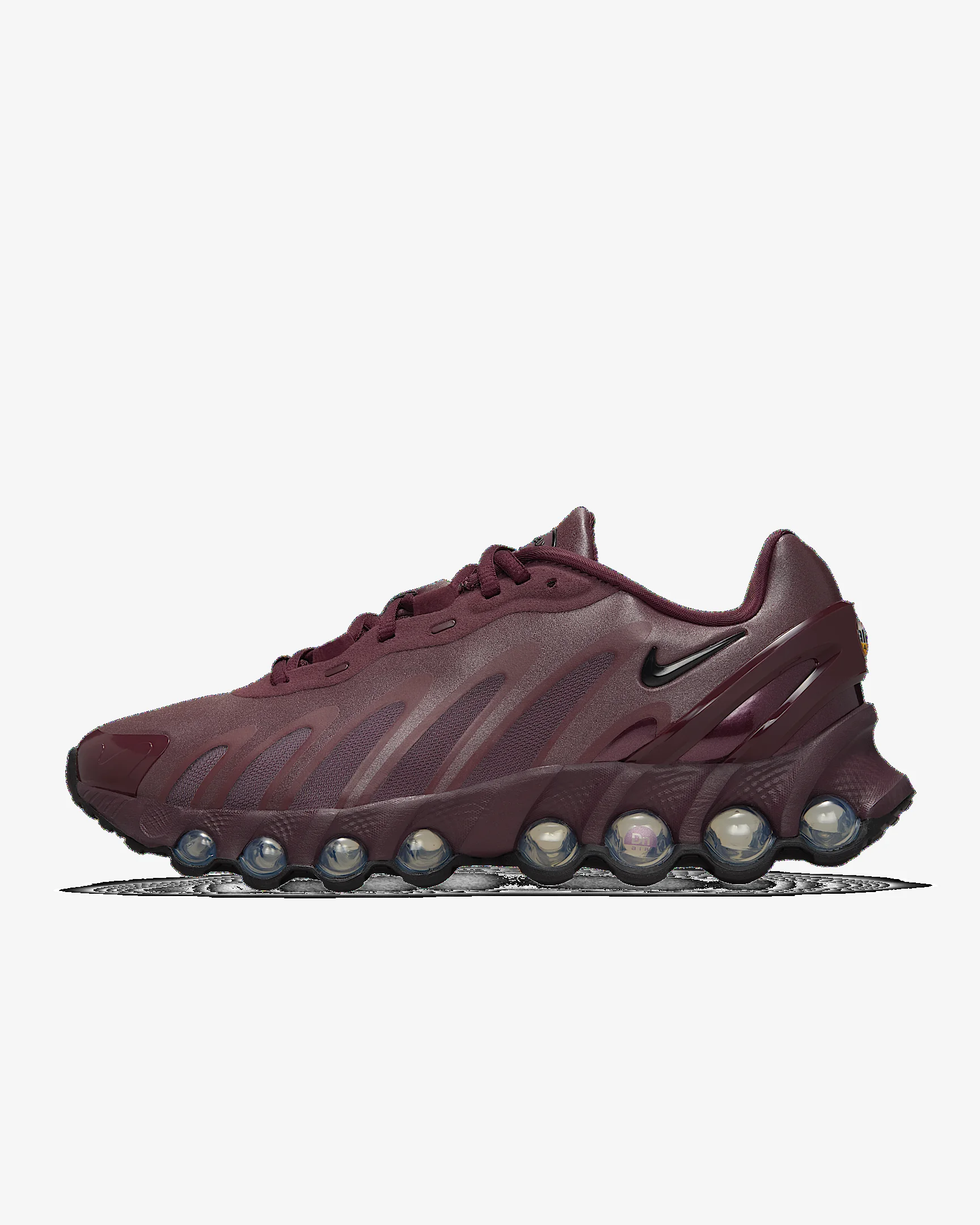 More Air, less bulk. The Dn8 takes our Dynamic Air system and condenses it into a sleek, low-profile package. Powered by eight pressurized Air tubes, it gives you a responsive sensation with every step. Enter an unreal experience of movement. More Benefits - Plastic heel clip helps hold your foot down for more containment. - Extra layer across toe tip adds durability. Product Details - Glossy Swoosh logo - Not intended for use as Personal Protective Equipment (PPE) - Shown: Burgundy Crush/Burgundy Crush/Metallic Silver/Black - Style: HF5509-602