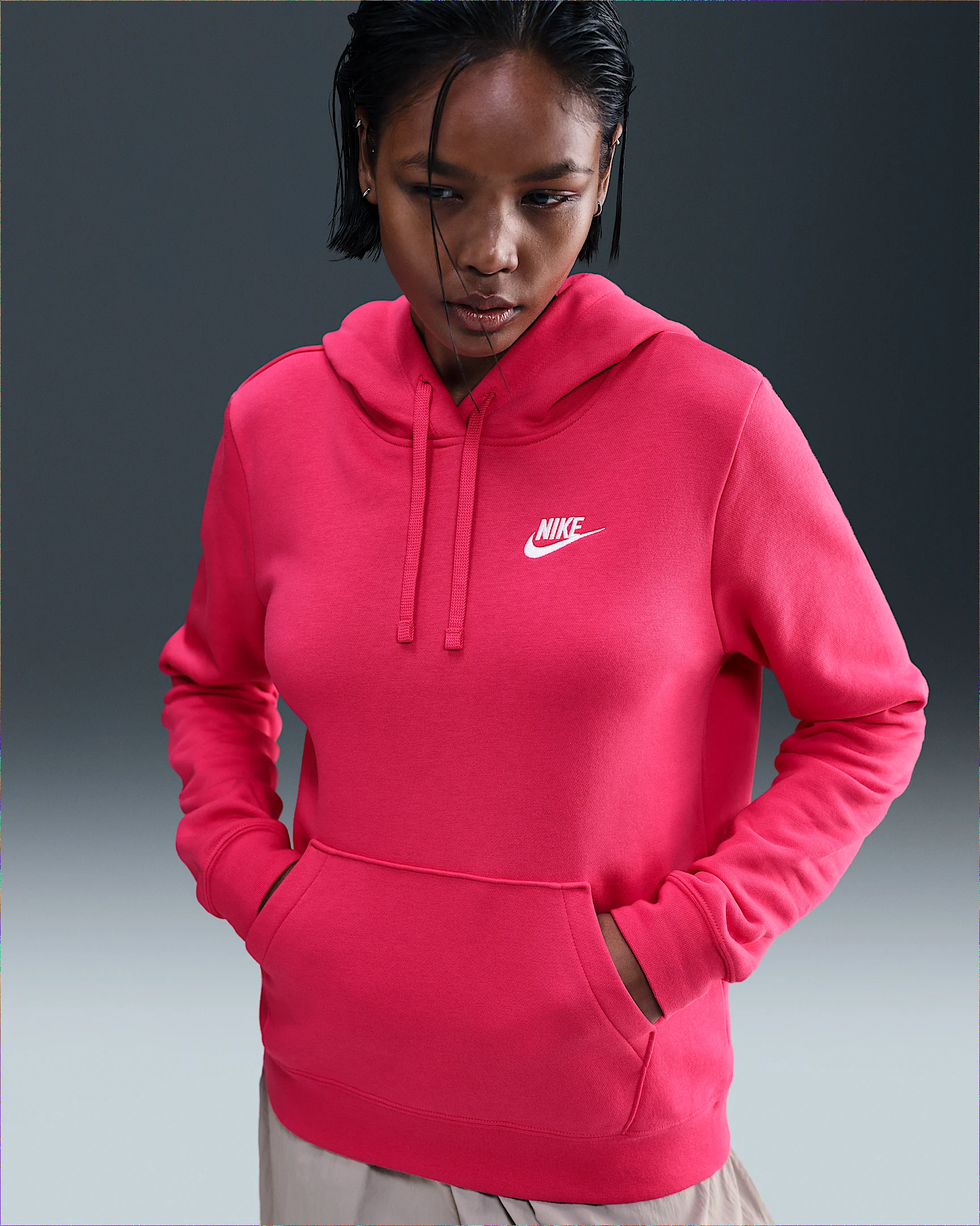 Club Fleece sweatshirts, universally loved for their coziness and consistency, are for everyone. A cold-weather essential, this easy-to-layer hoodie is a go-to whether you're pairing it with your favorite jacket or wearing it around the house. Benefits - Our best-selling fleece for a reason, Club Fleece has a cozy, familiar feel and consistent fit you can return to again and again. Brushed for added warmth and softness, it’s an ideal layer for colder temperatures. - Ribbed cuffs and hem help keep the hoodie in place while you move. - Jersey-lined 3-panel hood feels soft and smooth. Product Details - Body: 80% cotton/20% polyester. Hood Lining: 100% cotton. - Embroidered Futura logo - Machine wash - Imported - Shown: Rush Pink/White - Style: DQ5793-666 SIZE & FIT Model is wearing size S and is 5′7″170cm Standard fit: easy and traditional