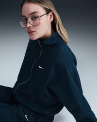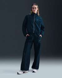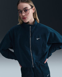 Simplicity and functionality come together in this lightweight jacket. Textured, water-repellent nylon and an elongated collar help keep you covered come rain or shine. Angled seams and a cropped length add dimension to the oversized fit. Benefits - Water-repellent finish helps keep you dry in wet weather. - Oversized fit makes layering easy. Product Details - 100% nylon - This product provides UVA and UVB protection from the sun only in the areas covered by the garment. To protect exposed areas, the use of good quality sunscreen is recommended. - Silver metal zipper - Side-seam pockets - Elastic at cuffs and hem - Embroidered Swoosh logo on left chest - Machine wash - Imported - Shown: Armory Navy/White - Style: HJ0999-478 SIZE & FIT Model is wearing size S and is 5′9″174cm Oversized fit: exaggerated and spacious