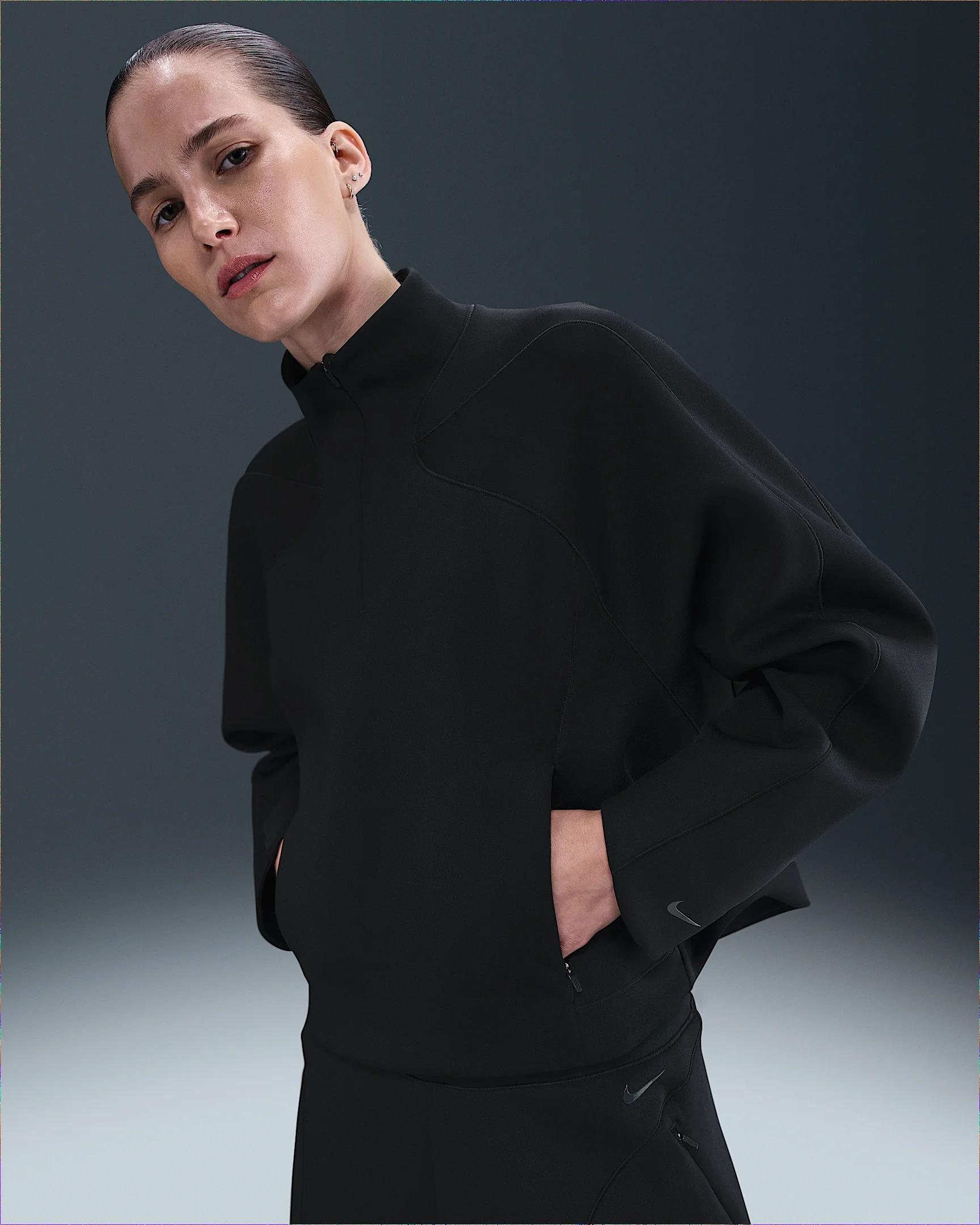 Polished but ready to work. Irresistibly smooth and sleek, this top feels soft and airy and has the perfect amount of flex and stretch for all of your moves. Benefits - Nike Dri-FIT technology moves sweat away from your skin for quicker evaporation, helping you stay dry and comfortable. - Discreet zip pockets at front secure your essentials. - Loose fit for a roomy feel. Product Details - Elegant design lines - Gloss silicone Swoosh logo - Body: 93% polyester/7% spandex. Pocket bags: 75% polyester/13% cotton/12% rayon. - Machine wash - Imported - Shown: Black/Black/Dark Smoke Grey - Style: HV3575-010 SIZE & FIT Model is wearing size S and is 5′10″178cm Loose fit: roomy and relaxed