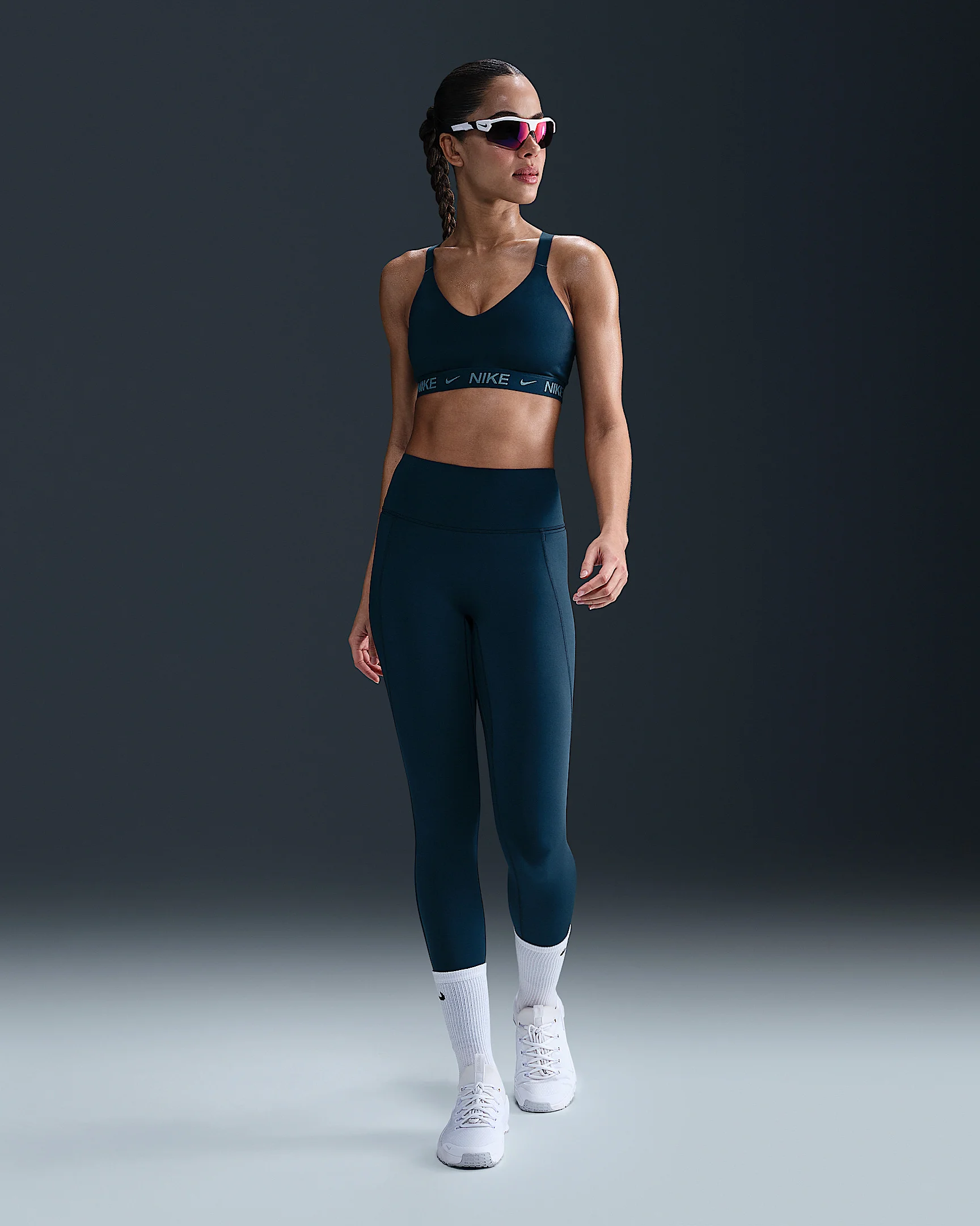 Don't let 'em see you sweat. We elevated the design of our Universa leggings to look smooth and help conceal sweat, thanks to a no-seam front and moisture-concealing technology. Their midweight, ultrasmooth fabric offers squat-proof stretch that helps lift and shape. Plus, an updated waistband resists rolling, so you can go all out with confidence. Product Details - 77% polyester/23% spandex - Laser-cut hem - Silicone Swoosh logo on left calf - Machine wash - Imported - Not intended for use as Personal Protective Equipment (PPE) - Shown: Armory Navy/Anthracite/Rift Blue - Style: HQ6813-478 SIZE & FIT Model is wearing size S and is 5′9″175cm Tight fit: snug and form-fitting Medium support: feels ke a snug hold to keep everything in place 78 length: hits at ankle High-Waisted: sits at or above your natural waist for more coverage