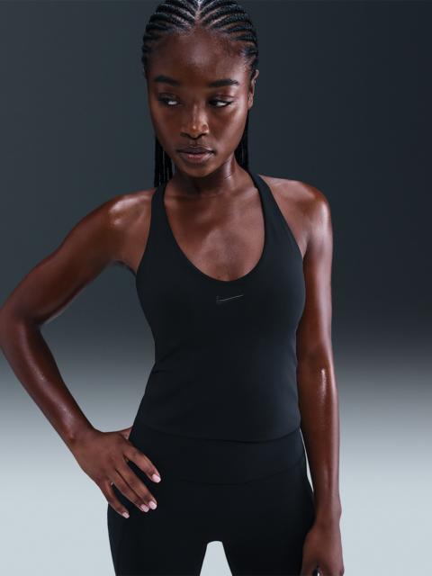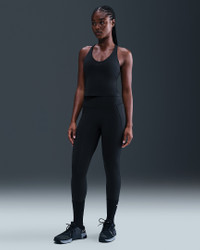 Don't let 'em see you sweat. Made with Stealth Evaporation tech, this ultrasmooth bra tank conceals moisture and feels sleek and cool to the touch. Its medium support gives you a snug hold and pads offer stay-put coverage so you can go all out with confidence. More Benefits - Keyhole at back offers cooling in high sweat area. Product Details - Gloss silicone Swoosh logo - Body: 77% polyester/23% spandex. Panels lining: 84% polyester/16% spandex. Mesh: 80% polyester/20% spandex; Elastic: 81% nylon/19% spandex. Pad: 100% polyurethane. - Machine wash - Imported - Shown: Black/Anthracite/Dark Smoke Grey - Style: IF0950-010 SIZE & FIT Model is wearing size S Model height: 5′8″173cm Model bust: 31″79cm Tight fit: snug and form-fitting Medium support: feels ke a snug hold to keep everything in place