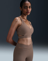 Balance your day in comfort in this Zenvy sports bra. Its lightweight, ribbed InfinaSoft fabric gives you softness that you can feel with every bend, stretch and shift. Benefits - Nike Dri-FIT technology moves sweat away from your skin for quicker evaporation, helping you stay dry and comfortable. - Removable pads let you customize your coverage. - Light support gives you a gentle hold with plenty of freedom, - Non-ribbed lining feels soft and smooth against skin. Product Details - Angled ribbing - Cutout at bottom band - Body: 77% nylon/23% spandex. Lining: 80% polyester/20% spandex. Pad top fabric/Pad back fabric: 100% polyester. Pad: 100% polyurethane. - Machine wash - Imported - Shown: Mink Brown/White - Style: HF5378-233 SIZE & FIT Model is wearing size S Model height: 5′8″173cm Model bust: 30″76cm Tight fit: snug and form-fitting Light support: feels ke a soft hug with plenty of freedom