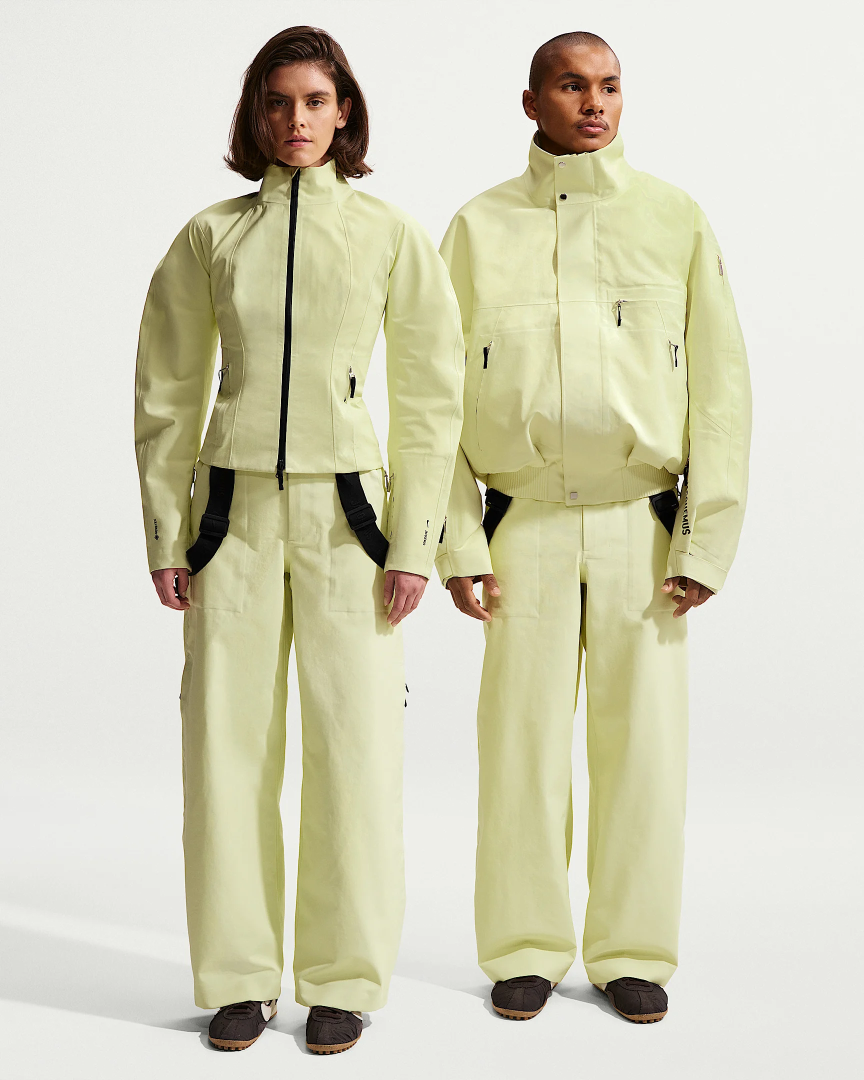 Nike and French designer Simon Porte Jacquemus come together once again to bring elegance to sportswear and outdoor staples. These tailored, voluminous pants are made of triple layer GORE-TEX, giving you waterproof support. Removable, adjustable straps let you select your style. Product Details - Water repellent - Removable straps - Body: 100% nylon. Straps: 51% nylon/43% polyester/6% spandex. - Machine wash - Imported - Shown: Citron Tint - Style: HQ6150-868 SIZE & FIT Standard fit: easy and traditional Fl length: hits below ankle