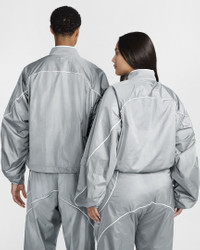 French designer Simon Porte Jacquemus and Nike team up to create and curate another collection. Clean, crisp and classic, this track jacket borrows some iconic design lines while bringing its own modern flair. The roomy sleeves and boxy cut keep the sporty look with a fresh, relaxed feel. It's fully equipped with water-repellent and wind-resistant crinkled nylon fabric to help you stay dry while cool mesh lining offers breathability. Product Details - Full-zip - Cuff snaps - Piping details - Body: 100% nylon. Lining: 100% polyester. - Machine wash - Imported - Shown: Particle Grey/White - Style: FV5697-073 SIZE & FIT Female model is wearing size S and is 5'8"173cm Male model is wearing size M and is 6'3"189cm Standard fit: easy and traditional
