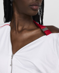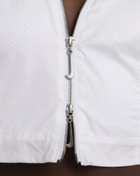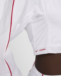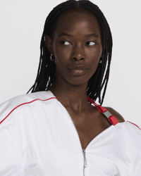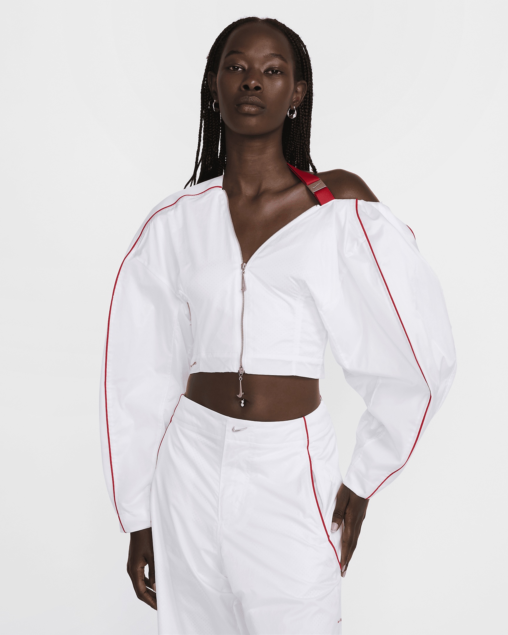 This track jacket offers a twist on a sport classic through an asymmetrical design. Oversized sleeves give you a bold look while the webbed strap with adjustable slider lets you create your own off-the-shoulder look. Crinkle nylon holds dimension while the sweat-wicking mesh helps keep you comfortable. Benefits - Two-way zipper gives you styling versatility. - Co-branded hardware references both Nike and Jacquemus. - Water-repellent finish helps keep you dry in wet weather. Product Details - Body: 100% nylon. Lining: 100% polyester. - Contrast piping - Machine wash - Imported - Shown: White/University Red - Style: FV5689-100 SIZE & FIT Standard fit: easy and traditional
