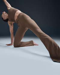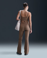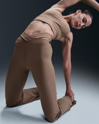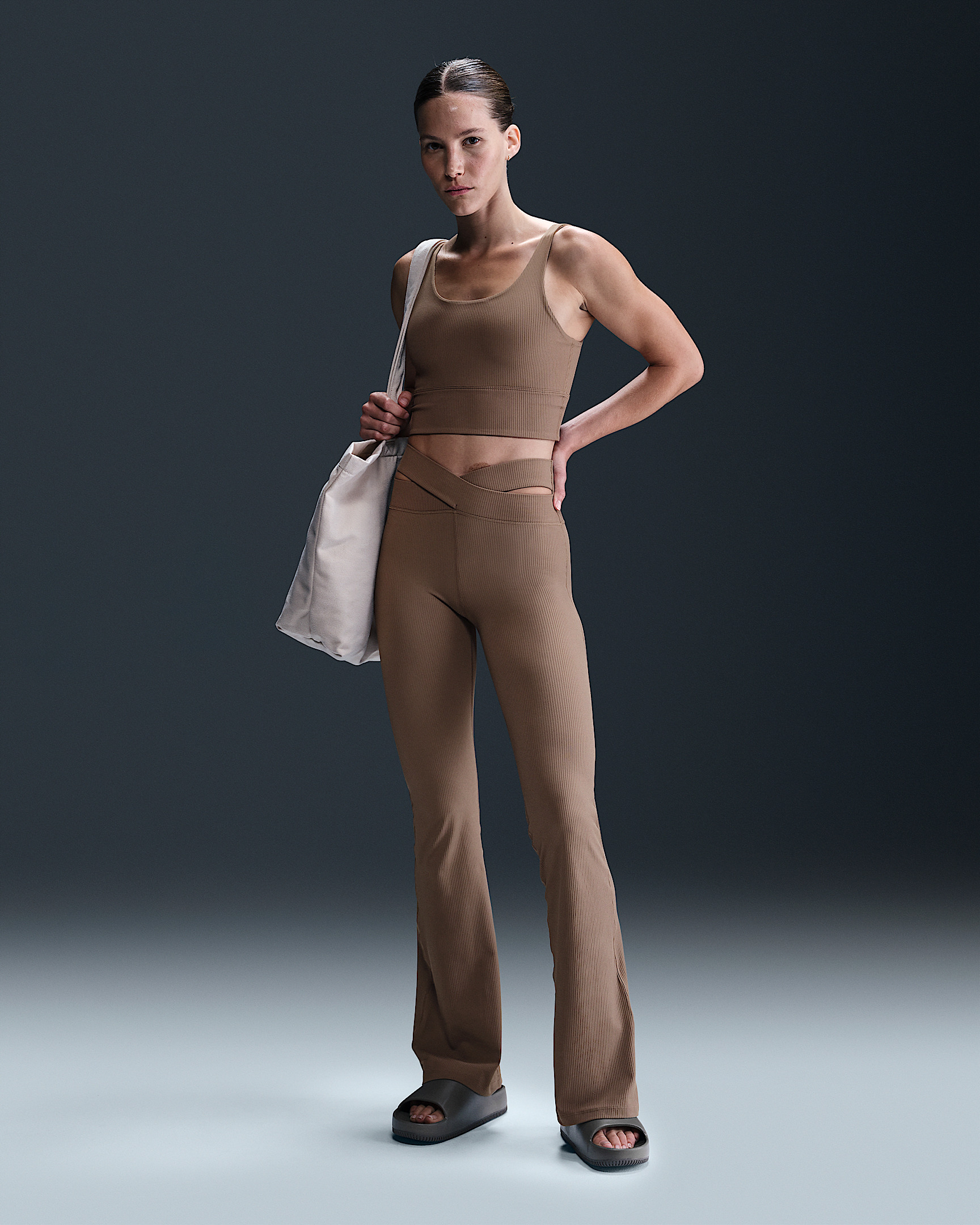 Balance your day in comfort in these flared leggings. Lightweight and squat-proof, their ribbed InfinaSoft fabric gives you softness that you can feel with every bend, stretch and shift. Benefits - Nike Dri-FIT technology moves sweat away from your skin for quicker evaporation, helping you stay dry and comfortable. - Encased elastic on front crossover waistband offers structure. - Back pocket fits most phones. Product Details - Body: 77% nylon/23% spandex. Gusset lining: 84% nylon/16% spandex. - Machine Wash - Imported - Shown: Mink Brown/Black/White - Style: HJ1846-233 SIZE & FIT Model is wearing size S and is 5′10″178cm Tight fit: snug and form-fitting Fl length: hits below ankle