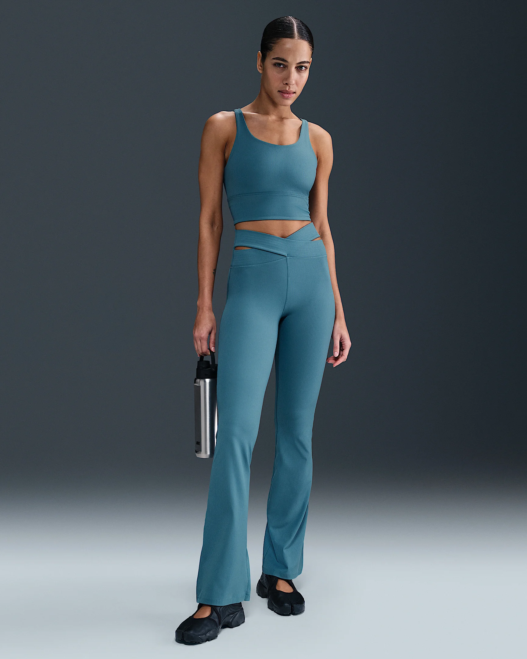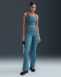 Balance your day in comfort in these flared leggings. Lightweight and squat-proof, their ribbed InfinaSoft fabric gives you softness that you can feel with every bend, stretch and shift. Benefits - Nike Dri-FIT technology moves sweat away from your skin for quicker evaporation, helping you stay dry and comfortable. - Encased elastic on front crossover waistband offers structure. - Back pocket fits most phones. Product Details - Body: 77% nylon/23% spandex. Gusset lining: 84% nylon/16% spandex. - Machine Wash - Imported - Shown: Smokey Blue - Style: HJ1846-006 SIZE & FIT Model is wearing size S and is 5′9″175cm Tight fit: snug and form-fitting Fl length: hits below ankle
