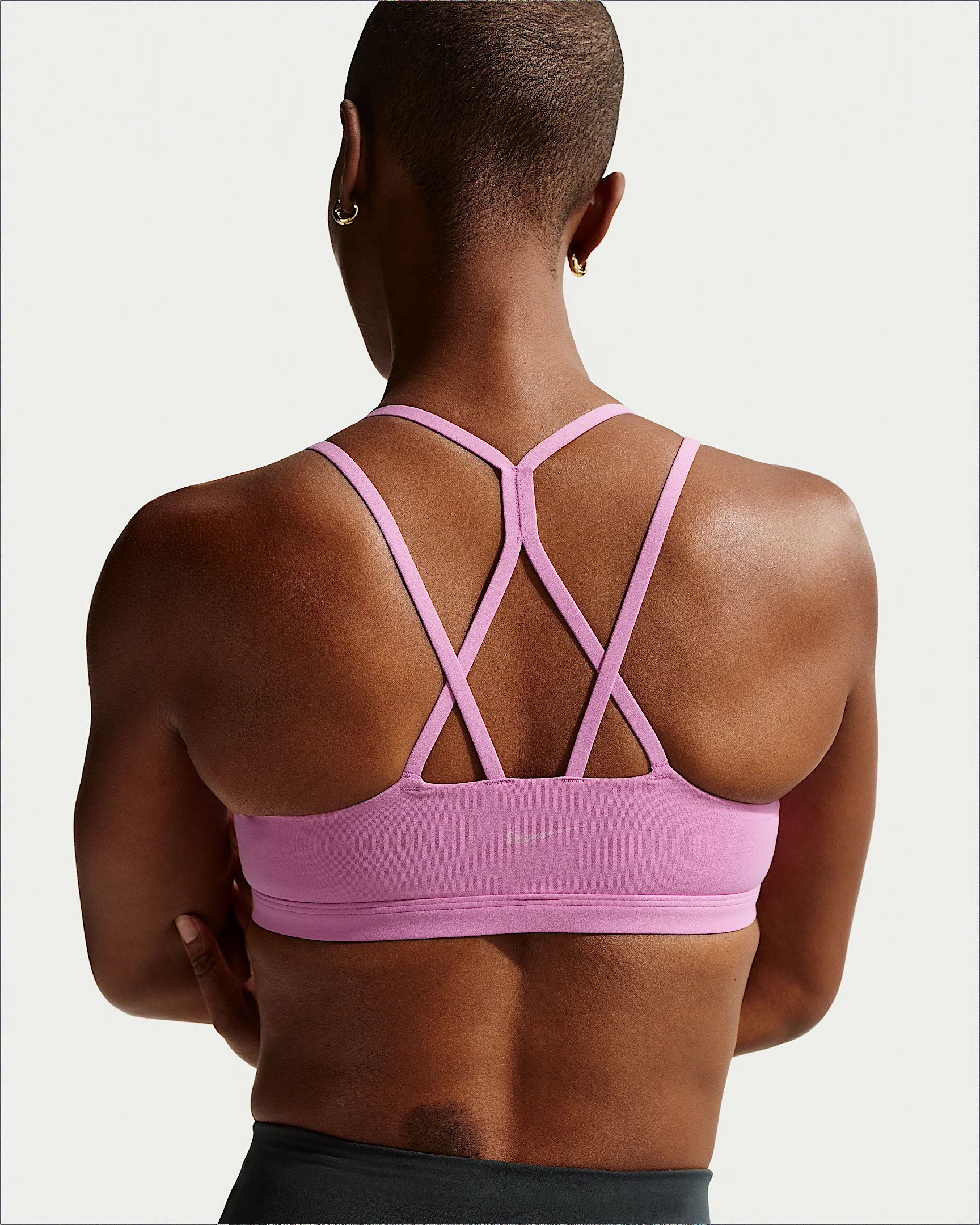 Bend and stretch in total confidence with this sweat-wicking Zenvy bra. Still lightweight, our updated InfinaSoft fabric is now ultrasoft with stretch designed to recover its shape wear after wear. A sewn-in pad offers optimal shaping and coverage. Benefits - Nike Dri-FIT technology moves sweat away from your skin for quicker evaporation, helping you stay dry and comfortable. - Light support gives you a gentle hold with plenty of freedom that's great for low-impact workouts or all-day comfort. - Sewn-in pad offers subtle shaping and coverage. Product Details - Body: 69% nylon/31% spandex. Panels lining: 88% polyester/12% spandex. Pad back fabric: 100% polyester. Pad: 100% polyurethane. - Machine wash - Imported - Shown: Light Magenta/White - Style: IB9847-503 SIZE & FIT Tight fit: snug and form-fitting Light support: feels ke a soft hug with plenty of freedom