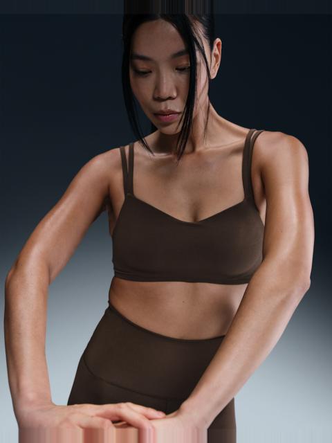 Feel calm and confident all day long in this strappy, gently supportive bra. A sewn-in 1-piece pad offers enhanced coverage and shaping while sweat-wicking technology helps keep you cool and comfortable. The fabric in the body and straps is lightweight, with softness that you can feel with every bend, stretch and shift. With a rounded V-neck to top it off, the bra has a clean finish that goes with any outfit. Benefits - Light support gives you a gentle hold with plenty of freedom that's great for low-impact workouts or all-day comfort. - Nike Dri-FIT technology moves sweat away from your skin for quicker evaporation, helping you stay dry and comfortable. Product Details - Body: 63% nylon/37% spandex. Front and back liner: 82% polyester/18% spandex. Pad: 100% polyurethane. Pad back fabric: 100% polyester. - Machine wash - Imported - Shown: Picante Red/White - Style: DO6608-633 SIZE & FIT Model is wearing size S Model height: 5′9″175cm Model bust: 32″81cm Tight fit: snug and form-fitting Light support: feels ke a soft hug with plenty of freedom