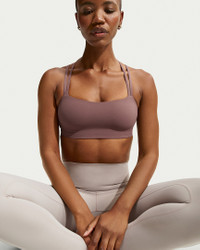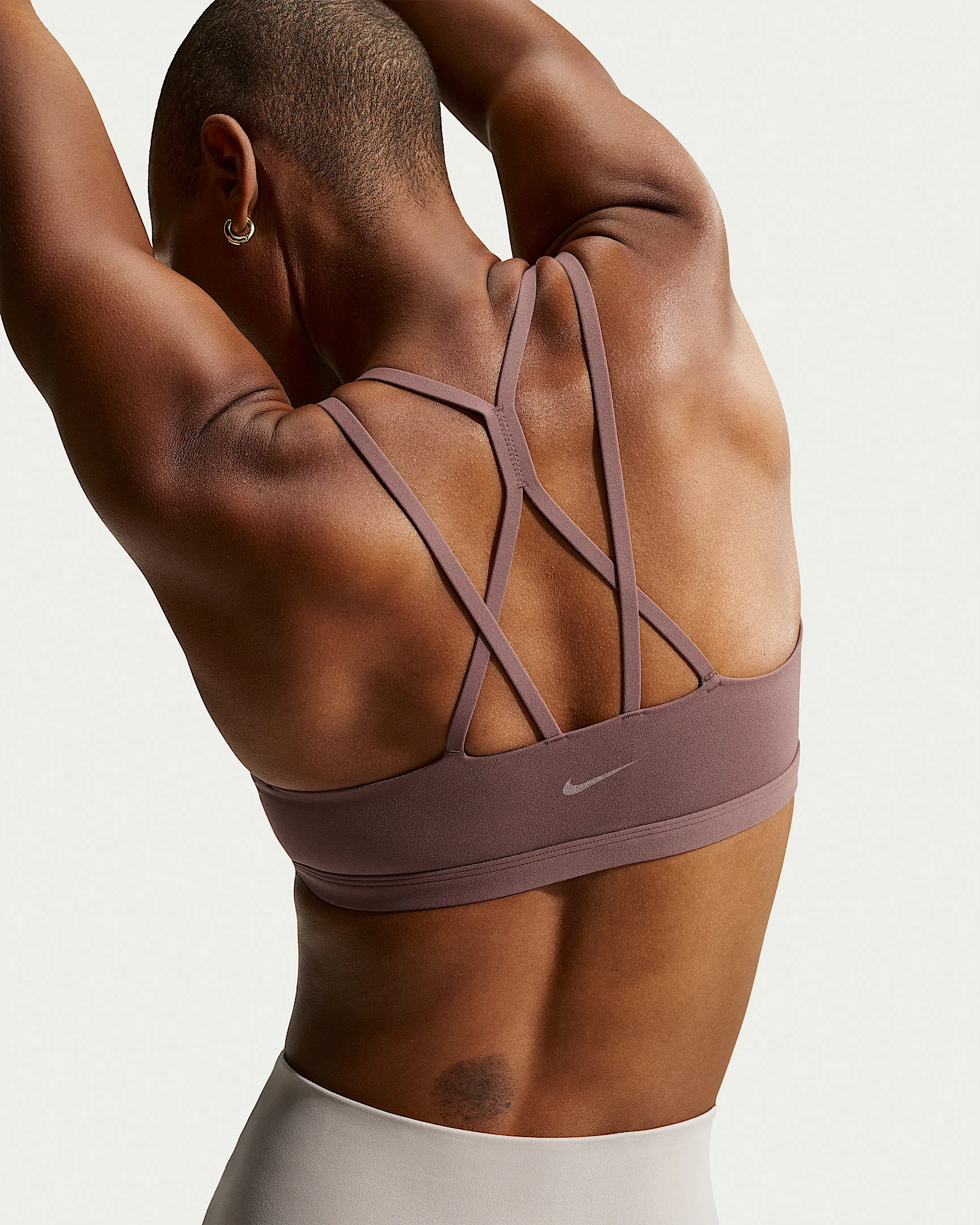 Bend and stretch in total confidence with this sweat-wicking Zenvy bra. Still lightweight, our updated InfinaSoft fabric is now ultrasoft with stretch designed to recover its shape wear after wear. A sewn-in pad offers optimal shaping and coverage. Benefits - Nike Dri-FIT technology moves sweat away from your skin for quicker evaporation, helping you stay dry and comfortable. - Light support gives you a gentle hold with plenty of freedom that's great for low-impact workouts or all-day comfort. - Sewn-in pad offers subtle shaping and coverage. Product Details - Body: 69% nylon/31% spandex. Panels lining: 88% polyester/12% spandex. Pad back fabric: 100% polyester. Pad: 100% polyurethane. - Machine wash - Imported - Shown: Tattoo/White - Style: IB9847-502 SIZE & FIT Model is wearing size S and is 5'11"180cm Tight fit: snug and form-fitting Light support: feels ke a soft hug with plenty of freedom
