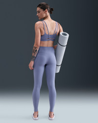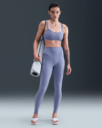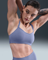 Feel calm and confident all day long in this strappy, gently supportive bra. A sewn-in 1-piece pad offers enhanced coverage and shaping while sweat-wicking technology helps keep you cool and comfortable. The fabric in the body and straps is lightweight, with softness that you can feel with every bend, stretch and shift. With a rounded V-neck to top it off, the bra has a clean finish that goes with any outfit. Benefits - Light support gives you a gentle hold with plenty of freedom that's great for low-impact workouts or all-day comfort. - Nike Dri-FIT technology moves sweat away from your skin for quicker evaporation, helping you stay dry and comfortable. Product Details - Body: 63% nylon/37% spandex. Front and back liner: 82% polyester/18% spandex. Pad: 100% polyurethane. Pad back fabric: 100% polyester. - Machine wash - Imported - Shown: World Indigo/White - Style: DO6608-499 SIZE & FIT Model is wearing size S Model height: 5′9″175cm Model bust: 33″84cm Tight fit: snug and form-fitting Light support: feels ke a soft hug with plenty of freedom