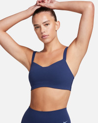 Feel calm and confident all day long in this strappy, gently supportive bra. A sewn-in 1-piece pad offers enhanced coverage and shaping while sweat-wicking technology helps keep you cool and comfortable. The fabric in the body and straps is lightweight, with softness that you can feel with every bend, stretch and shift. With a rounded V-neck to top it off, the bra has a clean finish that goes with any outfit. Benefits - Light support gives you a gentle hold with plenty of freedom that's great for low-impact workouts or all-day comfort. - Nike Dri-FIT technology moves sweat away from your skin for quicker evaporation, helping you stay dry and comfortable. Product Details - Body: 63% nylon/37% spandex. Front and back liner: 82% polyester/18% spandex. Pad: 100% polyurethane. Pad back fabric: 100% polyester. - Machine wash - Imported - Shown: Midnight Navy/White - Style: DO6608-410 SIZE & FIT Tight fit: snug and form-fitting Light support: feels ke a soft hug with plenty of freedom
