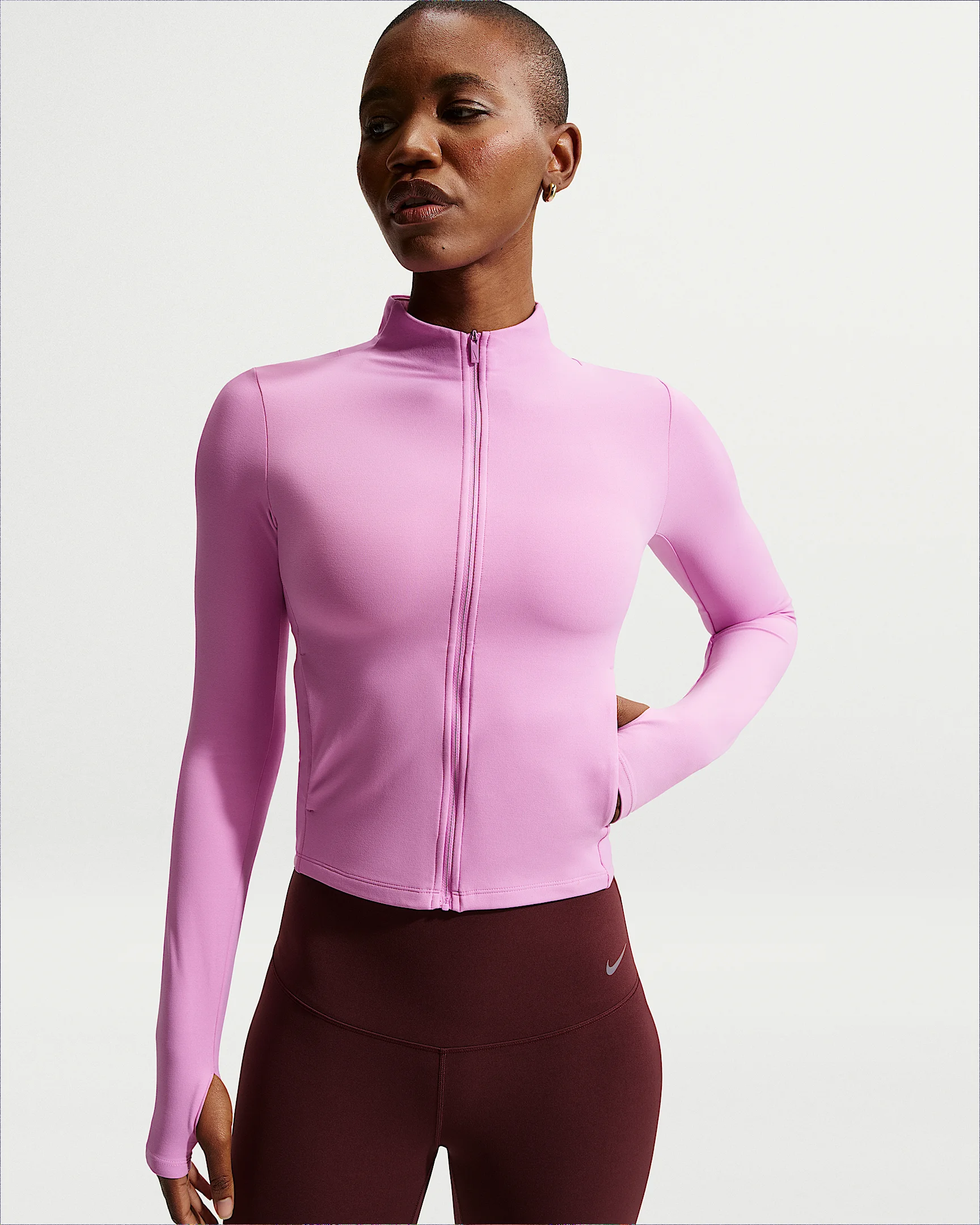 Bend and stretch in total confidence in this sleek, long-sleeve layer. Still lightweight, it's crafted from our updated InfinaSoft fabric, which is now ultrasoft with stretch designed to recover its shape wear after wear. Benefits - Nike Dri-FIT technology moves sweat away from your skin for quicker evaporation, helping you stay dry and comfortable. - Thumbholes let you extend your coverage and help hold the sleeves in place while you move. - Princess seams make for smooth, tailored fit. Product Details - Body: 69% nylon/31% spandex. Pocket bags: 72% nylon/28% spandex. - Machine Wash - Imported - Shown: Light Magenta/White - Style: II3927-503 SIZE & FIT Model is wearing size S and is 5'11"180cm Sm fit: sleek and tailored