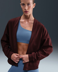 A sweat-wicking cardigan? Yeah, we did that. Easy to slip on and off, this oversized layer helps keep your gym commute and warm-up comfortable. Its peachy-soft fabric stretches with you, and is perfect for warding off a post-workout chill. Benefits - Nike Dri-FIT technology moves sweat away from your skin for quicker evaporation, helping you stay dry and comfortable. Product Details - Encased elastic at back hem - Swoosh logo at back - Elegant seams lines - 63% polyester/37% spandex - Machine wash - Imported - Shown: Burgundy Crush/White - Style: IB2980-652 SIZE & FIT Model is wearing size S and is 5′11″180cm Oversized fit: exaggerated and spacious