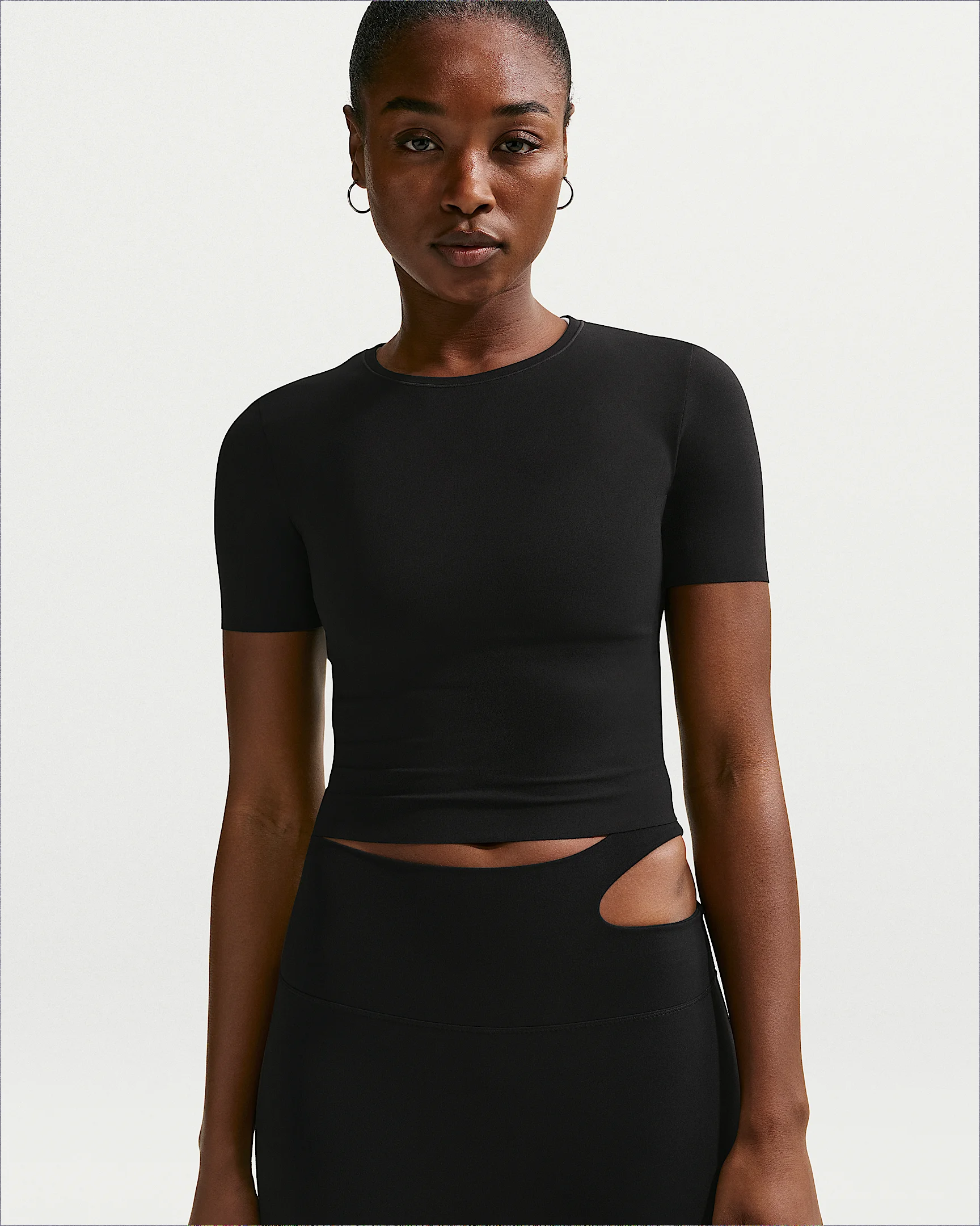 Bend and stretch in total confidence in this snug crop top. Still lightweight, our updated InfinaSoft fabric is now ultrasoft with stretch designed to recover its shape wear after wear. Benefits - Nike Dri-FIT technology moves sweat away from your skin for quicker evaporation, helping you stay dry and comfortable. - Subtly cropped hem is designed to fall just below your natural waist. Product Details - Raw cut hem - 69% nylon/31% spandex - Machine wash - Imported - Shown: Black/Cool Grey - Style: IB8964-010 SIZE & FIT Model is wearing size S and is 5′8″173cm Tight fit: snug and form-fitting