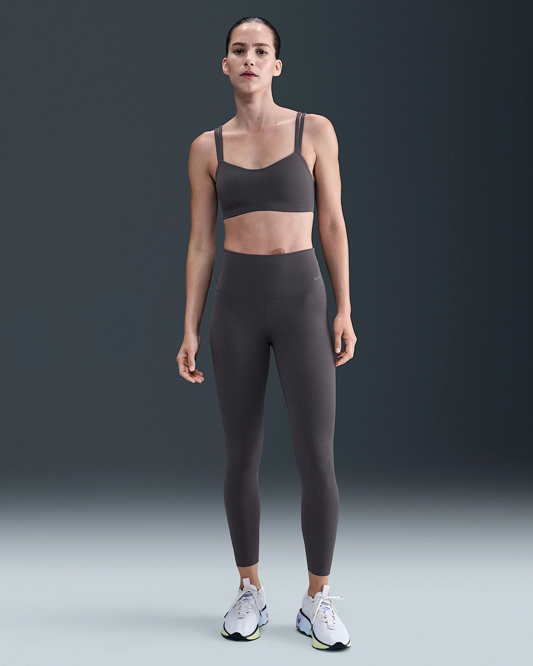 Whether it's yoga or a bike ride or a walk, you can move freely in our unbelievably soft Nike Zenvy leggings. Their InfinaSoft fabric is lightweight—but still squat-proof!—with softness that you can feel with every bend, stretch and shift. Fewer pockets give you a streamlined look, but the drop-in pocket at the center back is still big enough to hold your phone. Plus, they're durable enough for you to move, wash and wear again and again. Benefits - Designed to help reduce rolling, pinching and sliding, extra-wide waistband helps hold you up and smooths waist. - Nike Dri-FIT technology moves sweat away from your skin for quicker evaporation, helping you stay dry and comfortable. Product Details - 7/8 length - High-rise waistband - Body: 63% nylon/37% spandex. Gusset Lining: 84% nylon/16% spandex. - Machine wash - Imported - Not intended for use as Personal Protective Equipment (PPE) - Shown: Thunder Grey/Black - Style: DQ6015-036 SIZE & FIT Model is wearing size S and is 5′10″178cm Tight fit: snug and form-fitting Gentle support: feels ke a soft hug with plenty of freedom 78 length: hits at ankle High-Waisted: sits at or above your natural waist for more coverage