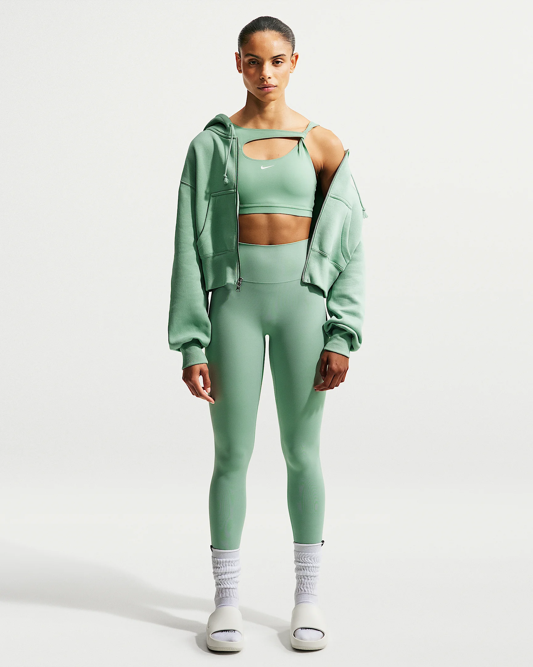 Bend and stretch in total confidence. Still lightweight, our updated InfinaSoft fabric is now ultrasoft with stretch designed to recover its shape wear after wear. Benefits - Nike Dri-FIT technology moves sweat away from your skin for quicker evaporation, helping you stay dry and comfortable. - We raised the waistband slightly for a true high-waisted fit. - No front seam helps keep the fabric from riding up, giving you a smooth fit and seamless look. - Hidden pocket at the back of the waistband fits most phones. Product Details - Raw hem - No front seam - Body: 69% nylon/31% spandex. Panels lining: 72% nylon/28% spandex. - Machine Wash - Imported - Shown: Steam/White - Style: II2862-006 SIZE & FIT Tight fit: snug and form-fitting Gentle support: feels ke a soft hug with plenty of freedom Fl length: hits below ankle High-Waisted: sits at or above your natural waist for more coverage