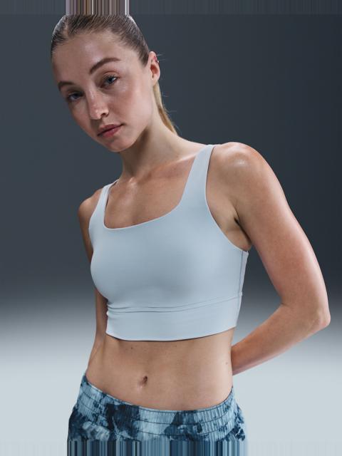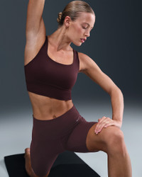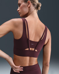 Find your bliss in this medium-support bra. A sewn-in 1-piece pad and longline silhouette offer enhanced coverage and shaping while sweat-wicking technology keeps you cool and comfortable. The fabric in the body and straps is lightweight, with softness that you can feel with every bend, stretch and shift. You might just forget you're wearing a bra at all. Benefits - Nike Dri-FIT technology moves sweat away from your skin for quicker evaporation, helping you stay dry and comfortable. - Strappy back with cutout adds breathability. - Medium support gives you a snug hold that helps keep everything in place. Product Details - Body: 63% nylon/37% spandex. Lining: 82% polyester/18% spandex. Pad: 100% polyurethane. Pad back fabric: 100% polyester. - Machine wash - Imported - Shown: Burgundy Crush/Sail - Style: DO6619-652 SIZE & FIT Model is wearing size S Model height: 5′11″180cm Model bust: 32″81cm Tight fit: snug and form-fitting Medium support: feels ke a snug hold to keep everything in place