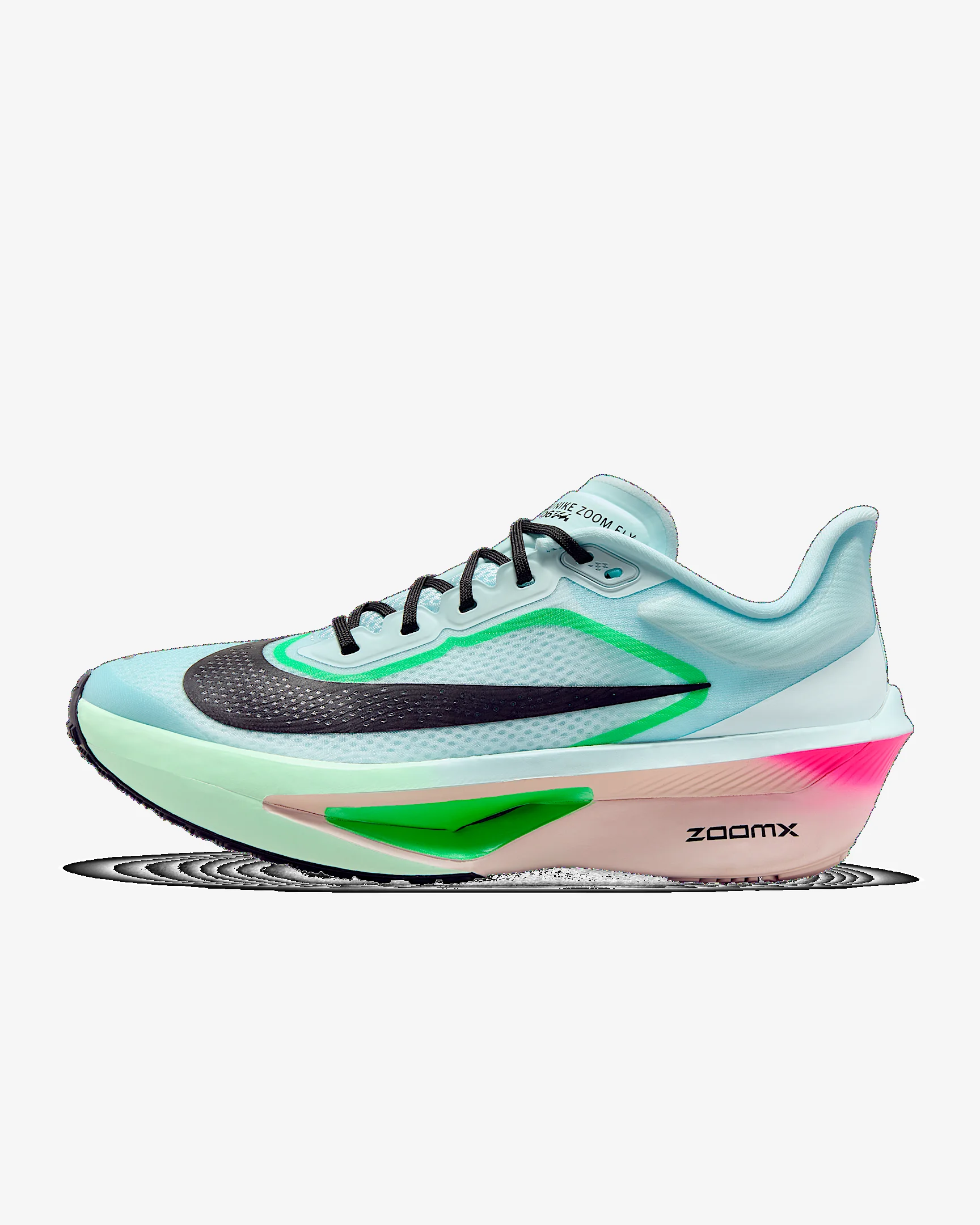The Zoom Fly 6 is with you every step of your run. Lighter than the Zoom Fly 5, its responsive ZoomX foam adds energy return to each stride, while a carbon fiber Flyplate helps propel you to the finish line. Product Details - Weight: Approx. 214g/7.5oz (Women's US 8) - Heel-to-toe drop: 8mm - Reflective details - Not intended for use as Personal Protective Equipment (PPE) - Shown: Glacier Ice/Hyper Pink/Green Shock/Black - Style: FN8455-402 SIZE & FIT Fits small; we recommend ordering a half size up