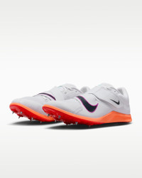 Pop a personal best in a model specifically designed for jumping events. Forefoot spikes and secondary heel traction give you confidence in wet or dry conditions on various track surfaces and different takeoff boards. A thick, yet lightweight cushioned heel and a wider shoe base help withstand the demands of jumping at full throttle. More Benefits - Lightweight, snappy plate gives you aggressive sturdiness and stability that’s ideal for both sprinting and takeoff. - Padded collar delivers support and comfort. Product Details - Designed for long jump, triple jump, high jump and pole vault - Foam midsole - Shown: White/Hyper Turquoise/Bright Crimson/Obsidian - Style: DR2756-101 SIZE & FIT Fits small; we recommend ordering a half size up