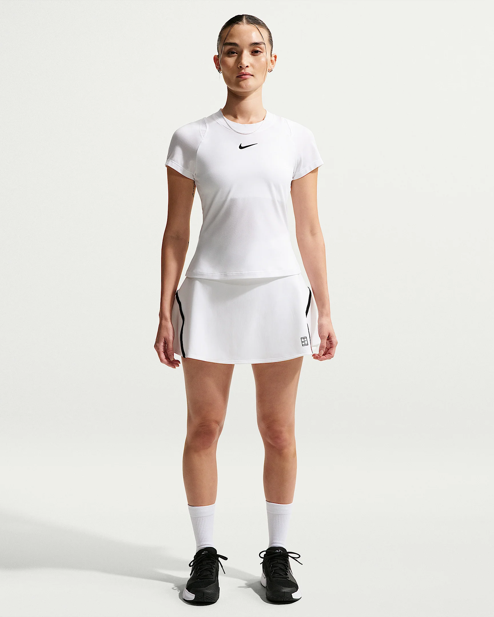 Lined with stretchy, sweat-wicking shorts, this high-waisted skirt has the court-ready style and performance your game demands. Pockets on the shorts provide quick storage for tennis balls and daily essentials. Benefits - Nike Dri-FIT technology moves sweat away from your skin for quicker evaporation, helping you stay dry and comfortable. - Stretchy built-in shorts have pockets on both legs. - Soft ribbed skirt fabric has optimal stretch for peak performance. Product Details - Silicone NikeCourt logo - Piping - 71% polyester/29% spandex - Machine Wash - Imported - Shown: White/Black - Style: II3624-100 SIZE & FIT Standard fit: easy and traditional
