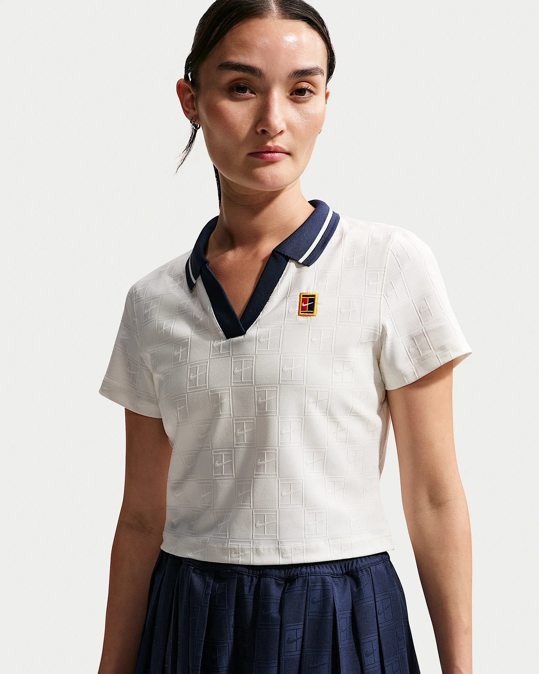 On-court style ready for everyday things, this sweat-wicking top help you stay dry and comfortable while adding a little tennis flair to your look. Its cropped length is designed with our high-waisted shorts and skirts in mind. Benefits - Nike Dri-FIT technology moves sweat away from your skin for quicker evaporation, helping you stay dry and comfortable. - Textured jacquard knit fabric stretches and wicks sweat through all your moves. Product Details - NikeCourt patch - 96% polyester/4% spandex - Machine wash - Imported - Shown: Sail/Midnight Navy - Style: IB0772-133 SIZE & FIT Model is wearing size S and is 5'7"170cm Tight fit: snug and form-fitting