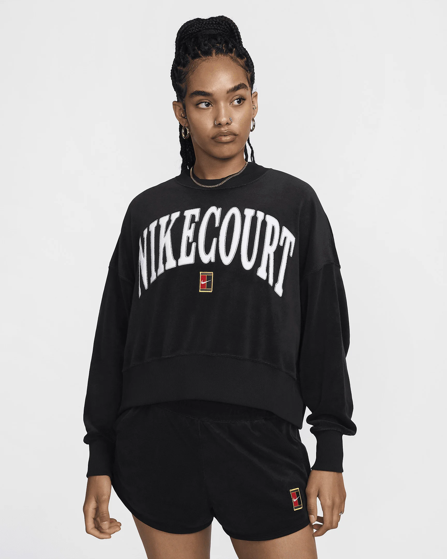 Bring classic style back to the court in this cropped sweatshirt. Its midweight terry fabric and dramatic, oversized fit help keep you cozy through your full swing. Product Details - "NikeCourt" applique across chest - NikeCourt patch at center chest - Ribbed cuffs, collar and hem - Body: 80% cotton/20% polyester. Rib: 75% cotton/22% polyester/3% spandex. - Machine wash - Imported - Shown: Black/Black/Flat Pewter/White - Style: FQ2242-010 SIZE & FIT Model is wearing size S and is 5′10″177cm Oversized fit: exaggerated and spacious