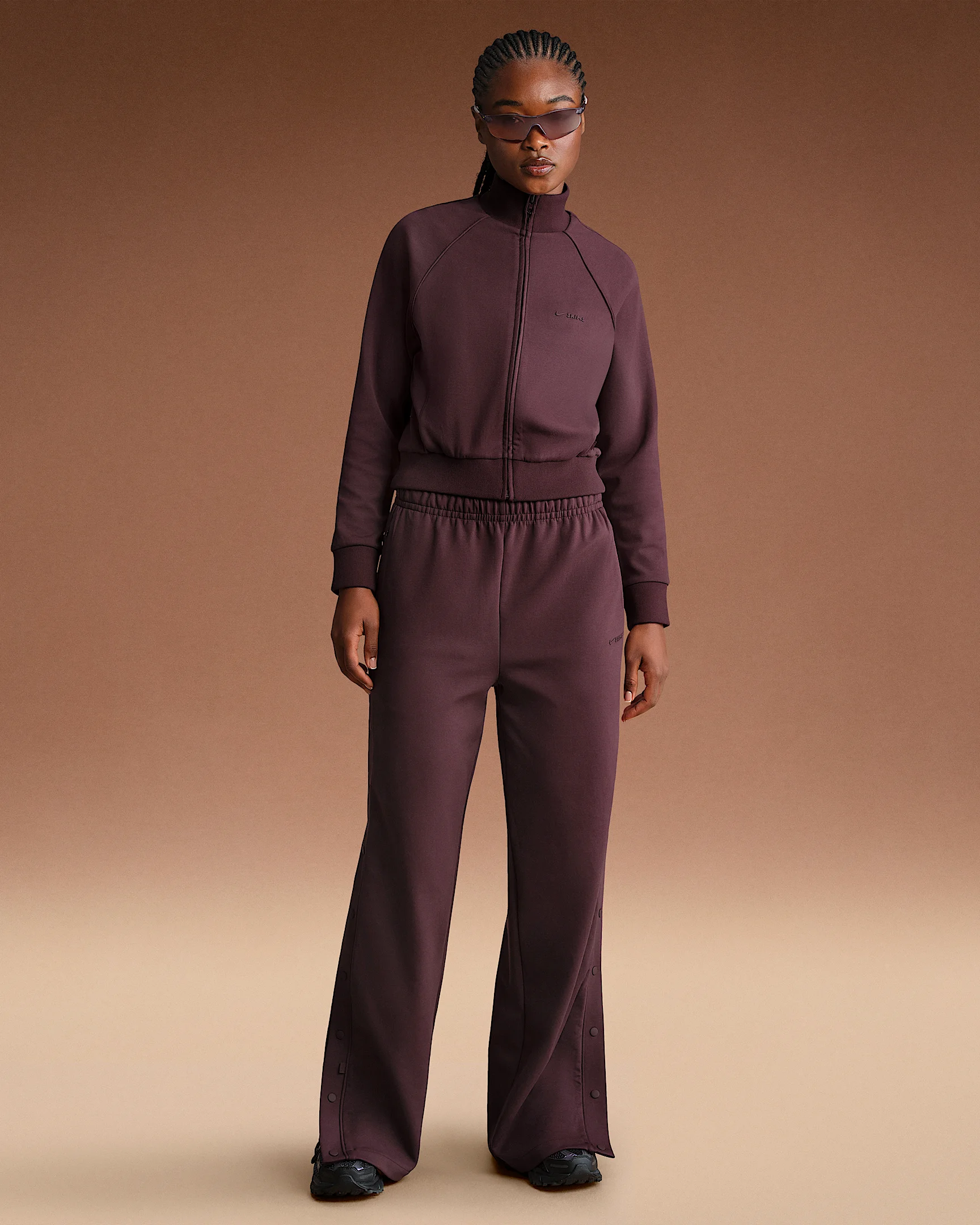 Crafted from smooth knit fabric, our track-inspired pants easily layer over your workout gear. Snaps at the sides allow for airflow and let you play with your style. Benefits - Our Matte Tricot knit fabric is smooth for a comfortable, wear-all-day feel. - Elastic waistband with drawcord helps you customize your fit. Product Details - Snaps at the sides - Zippered side pockets - 33" inseam - Matte silicone logo on wearer's left leg - 50% cotton/46% polyester/4% spandex - Machine wash - Imported - Shown: NSKM CURRANT - Style: BOWLG3533-CUR SIZE & FIT Model 1 is wearing size S and is 5'8"173cm Model 2 is wearing size 2X and is 5'10"178cm Loose fit: roomy and relaxed Fl length: hits below ankle Inseam: 33"