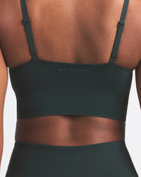 This bra lifts and enhances with wireless contoured pads and adjustable straps for light support. We designed it with our sculpting Matte fabric, sweat-wicking technology and longline coverage to make it a studio essential you can wear anywhere. Benefits - Our soft Matte fabric is designed to sculpt and smooth. - Nike Dri-FIT technology moves sweat away from your skin for quicker evaporation, helping you stay dry and comfortable. - Mesh lining helps add breathability. - Long-line design provides added coverage and support. - Adjustable straps help you personalize your fit. - Wireless contoured pads lift and enhance. Product Details - Pullover style - Four-way stretch - Scoop neck - Silicone matte logo at center back - 83% polyamide/17% Lycra® spandex - Machine wash - Imported - Shown: NSKM DARK TEAL/NSKM DARK TEAL - Style: BRSPT5115-DKT SIZE & FIT Model is wearing size S and typically wears size 30B Tight fit: snug and form-fitting Light support: feels ke a soft hug with plenty of freedom