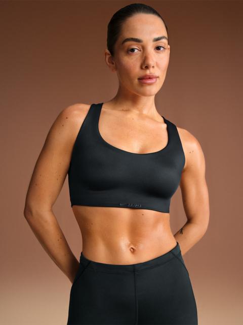 Designed to feel luxuriously light, our quick-drying Shine fabric gives this high-support bra a sleek look with subtle sheen. Built-in pads work with a racerback design, high neck and internal bonded panels to provide extra support and coverage. Benefits - Our sleek Shine fabric is lightweight and breathable with a smoothing fit and subtle sheen. - Thin, built-in pads mold to your body for comfortable coverage. - Mesh lining and a cutout at the lower back add breathability. Product Details - Hook-and-eye closure - Silicone matte logo at center front - 78% nylon/22% spandex - Machine wash - Imported - Shown: NSKM Obsidian - Style: BRSPT7004W-OBD SIZE & FIT Model 1 is wearing size 34C with a bust size of 32"81cm Model 2 is wearing size 40D with a bust size of 40"102cm Tight fit: snug and form-fitting High support: feels ke locked in support that keeps motion to a minimum