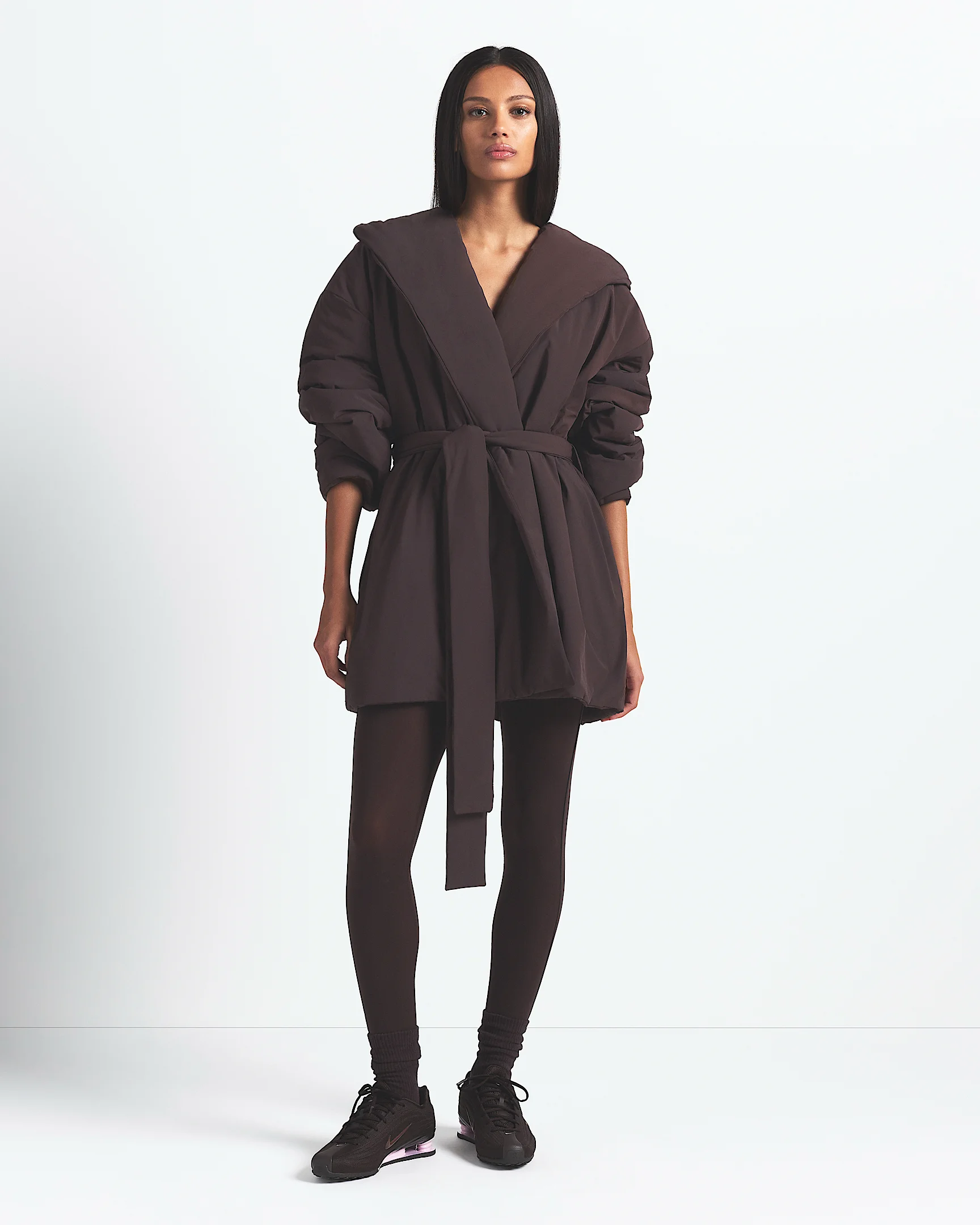 Head to your workout—or just a casual hang with friends—in warmth and style. Perfect for chilly days, this belted wrap coat uses lightweight synthetic fill to help you stay toasty. Plus, the shawl collar extends into a hood to help keep you extra cozy when the wind picks up. Benefits - Our Woven Nylon fabric is lightweight and smooth with a touch of stretch. - Synthetic fill helps keep you insulated and warm. - Belt loops at the sides help hold the belt in place. - Zippered side pockets provide secure storage. Product Details - Matte silicone logo at center back neck - Shell: 85% nylon/15% spandex. Fill: 100% polyester. - Machine wash - Imported - Shown: NSKM PHOENIX - Style: LSLSL10423W-PHO SIZE & FIT Model is wearing size XS and is 5'9"175cm Oversized fit: exaggerated and spacious