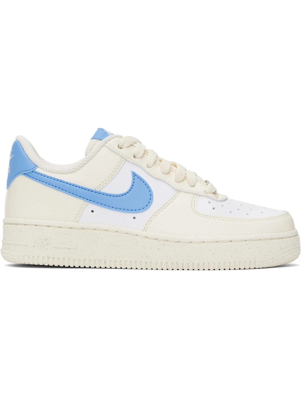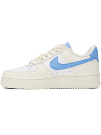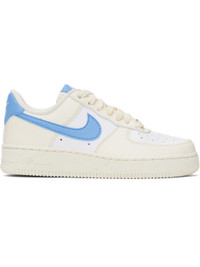 Low-top grained leather sneakers in off-white, blue, and white. · Perforations throughout · Logo plaque at lace-up closure · Logo patch at padded tongue · Padded collar · Swoosh applique at sides · Logo embroidered at heel tab · Mesh lining · Logo embossed at outer foam rubber midsole · Treaded rubber sole Please note that this item may be shipped only within North America. Supplier color: Pale Ivory/White/Sail/University Blue Upper: leather. Sole: rubber. Made in Viet Nam 251011F128149