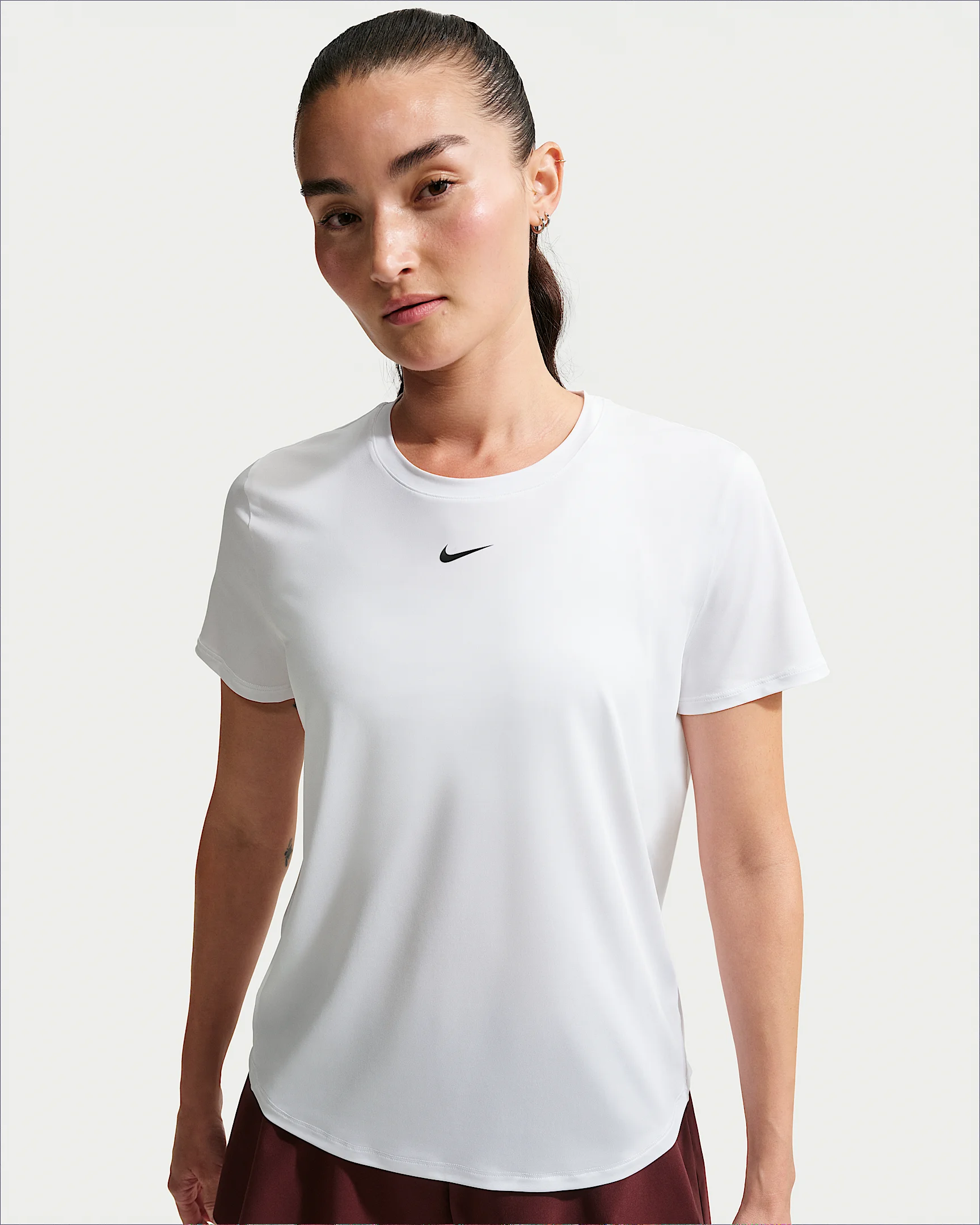 Up for a workout or down to chill, this Nike One Classic top is ready for whatever you are. Lightweight, silky-smooth fabric dries quickly and works for wherever your day takes you. A timeless, easy-fitting style and sweat-wicking tech help you feel confident, comfortable and dry from your morning stroll to your evening wind-down—and at all the stops in between. Product Details - 89% polyester/11% spandex - Machine wash - Imported - Reflective logo at center chest - Not intended for use as Personal Protective Equipment (PPE) - This product provides UVA and UVB protection from the sun only in the areas covered by the garment. To protect exposed areas, the use of good quality sunscreen is recommended. - Shown: White/Black - Style: FN2798-101 SIZE & FIT Model is wearing size S and is 5'7"170cm Standard fit: easy and traditional