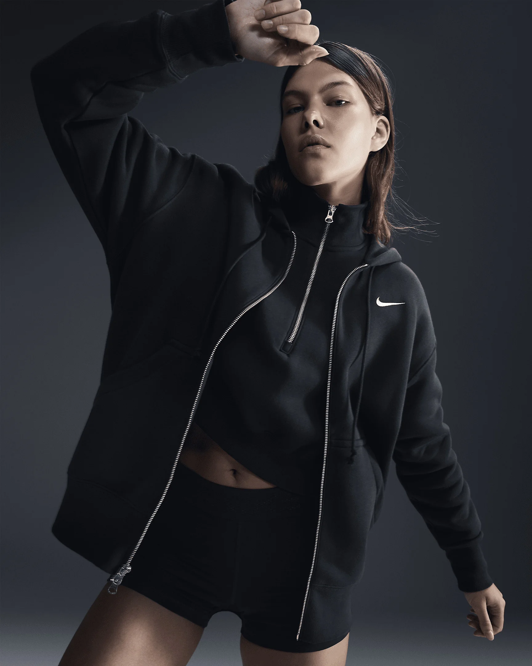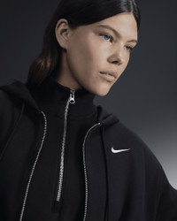 Grounded in style, comfort and versatility, meet our take on luxury loungewear. This zip-up hoodie helps you stay cozy all day long, thanks to midweight fleece that feels soft yet structured. Plus, exaggerated details (like the oversized pocket and taller ribbing) give you a trend-right look. Benefits - Our midweight brushed fleece feels extra soft on the inside and smooth on the outside, helping you stay cozy while keeping its structured shape. - Dropped shoulder seams and oversized fit provide a casual, relaxed look. Product Details - Full zipper - Drawcord hood - Elongated ribbing - Embroidered Swoosh logo - Body: 80% cotton/20% polyester. Hood lining: 100% cotton. - Machine wash - Imported - Shown: Black/Sail - Style: DQ5758-010 SIZE & FIT Olympic medast, Ibtihaj Muhammad is wearing size L and is 5'7"170cm Oversized fit: exaggerated and spacious Fits large; we recommend ordering a size down